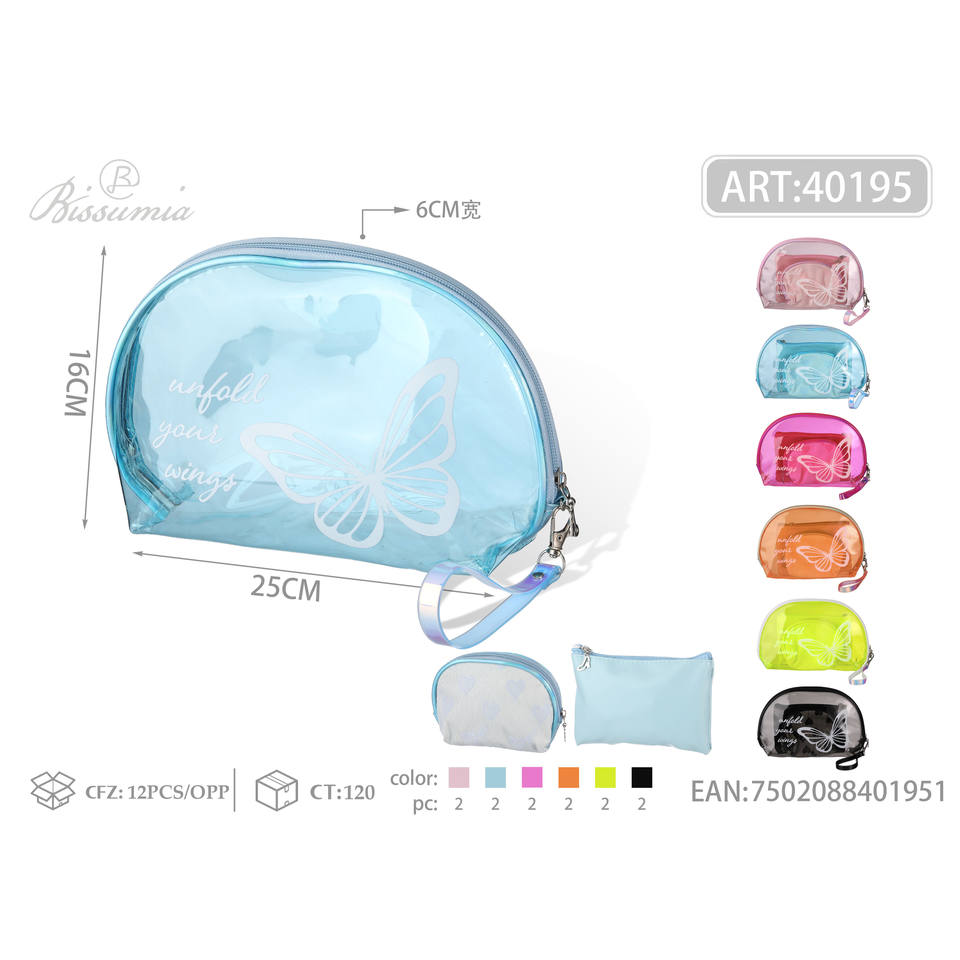 Mariposa transparente de tres piezas de PVC y bolsa de cosméticos de tela Estuche de maquillaje de viaje de moda con cierre de cremallera Patrón de dibujos animados