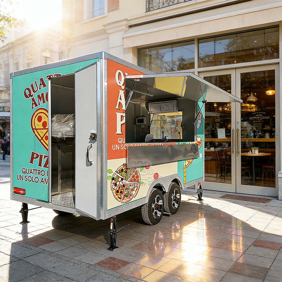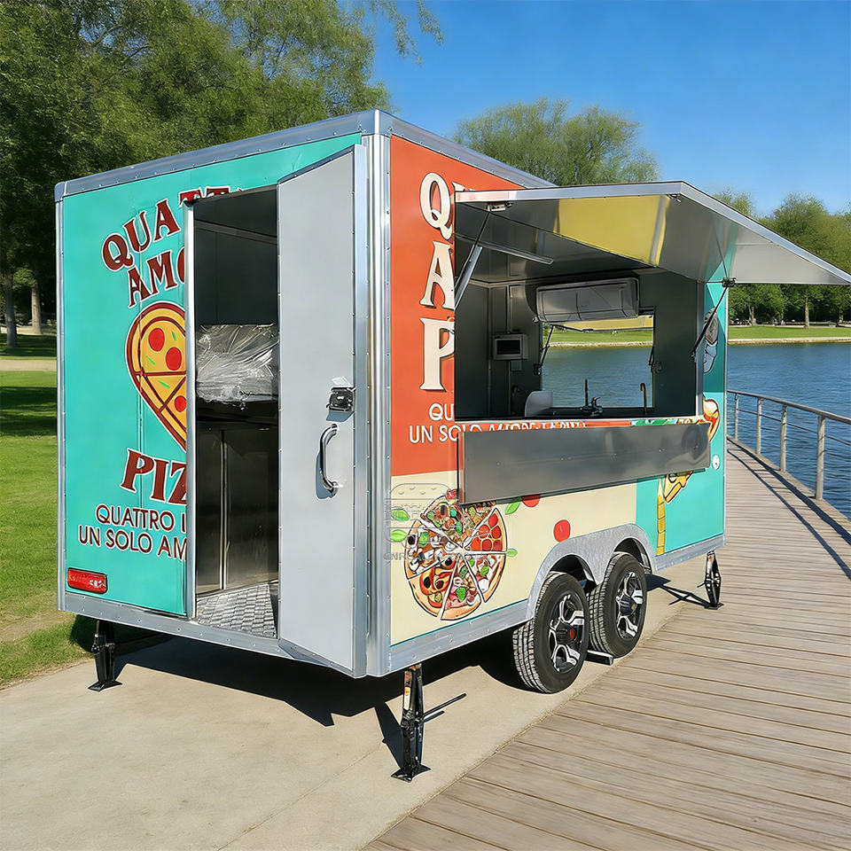 Remolque de cocina móvil cuadrado aprobado por CE DOT, chasis de acero galvanizado, totalmente equipado para pizza, barbacoa y comida rápida.