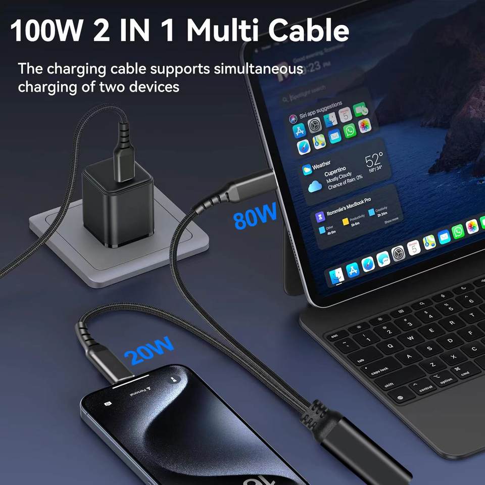 CE/FCC/ROHS Nylon trenzado PD 100W 2 en 1 Cable de carga rápida Cable USB tipo C para iPhone 16/15/lPad Air/MacBook Pro/Galaxy S23