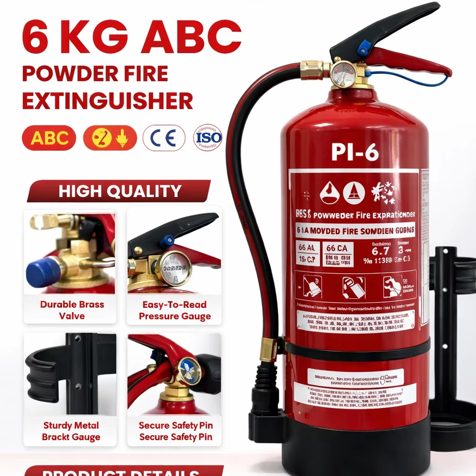 Extintor de Incendios Portátil CE de 6 kg con Polvo ABC, Cilindro de Acero Inoxidable | Sistema de Alivio de Presión Integrado | Manguera de Goma Flexible |