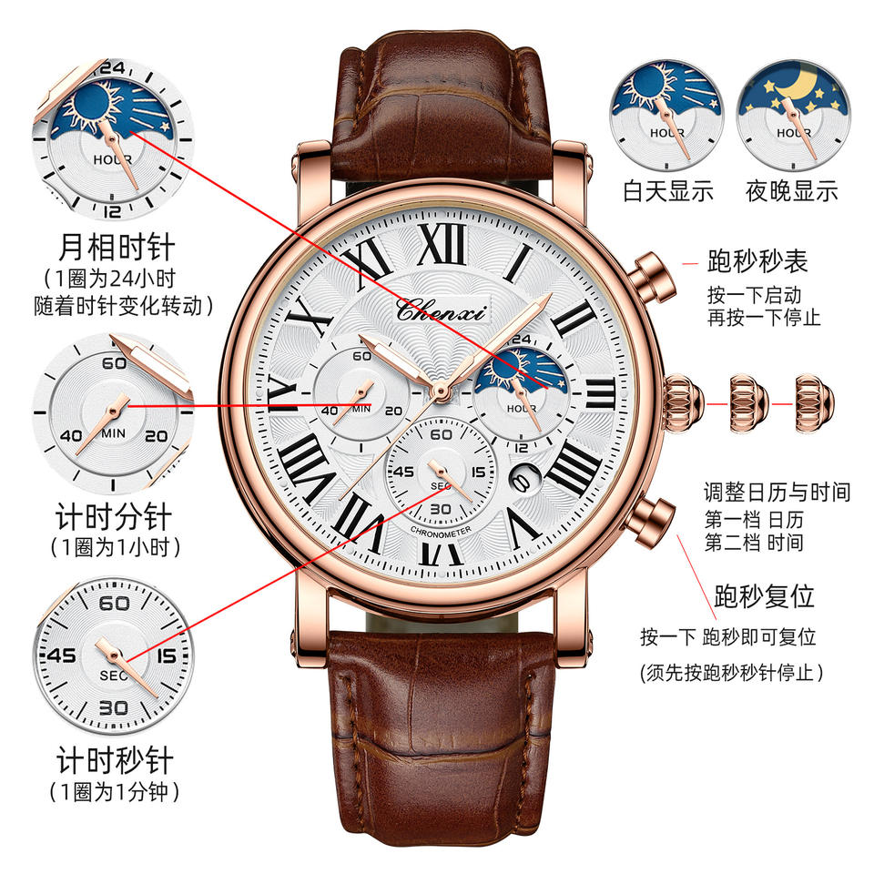 Característica:Fecha automática, Día/fecha, Fase lunar, Resistente al agua, Impermeable, Luminoso
