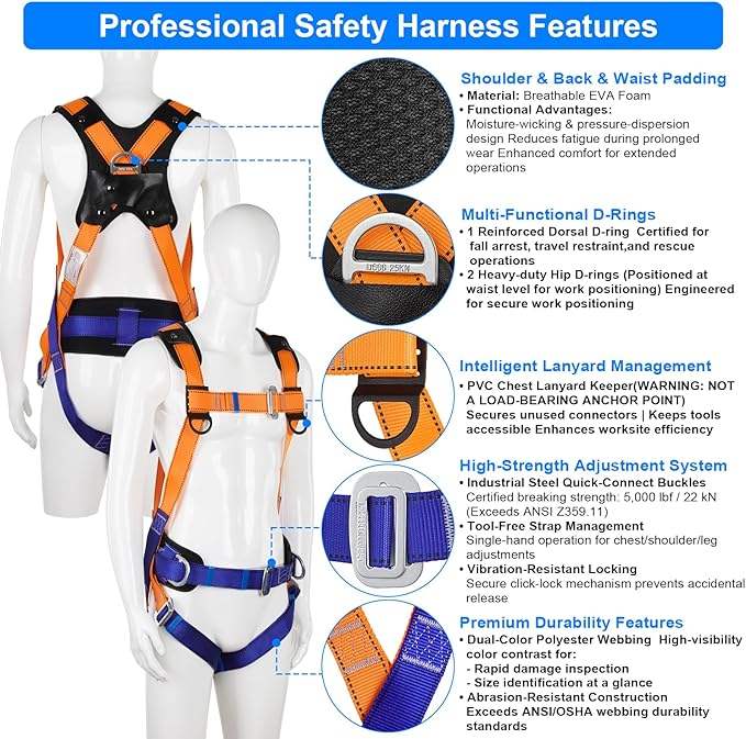 Arnés de Seguridad de Cuerpo Completo CITYCITY, Duradero, Certificado por ANSI y OSHA, Protección Contra Caídas para Trabajos en Altura, Techado y Construcción