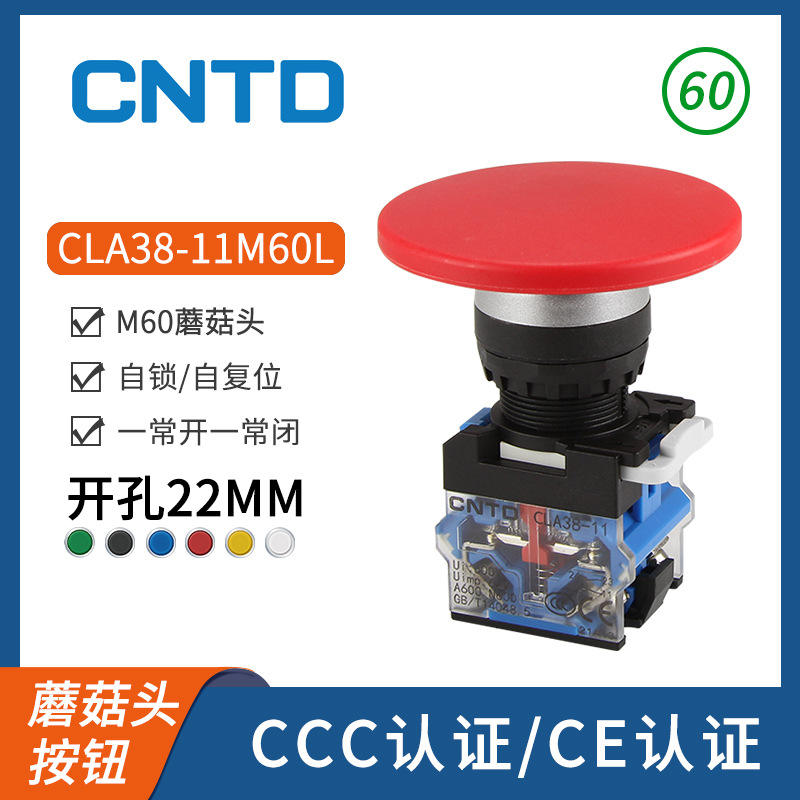Interruptor de Botón Pulsador Autoblocante Eléctrico CNTD Changde CLA38-11M60L-R, Material Plástico con Orificio de Montaje de 22 mm