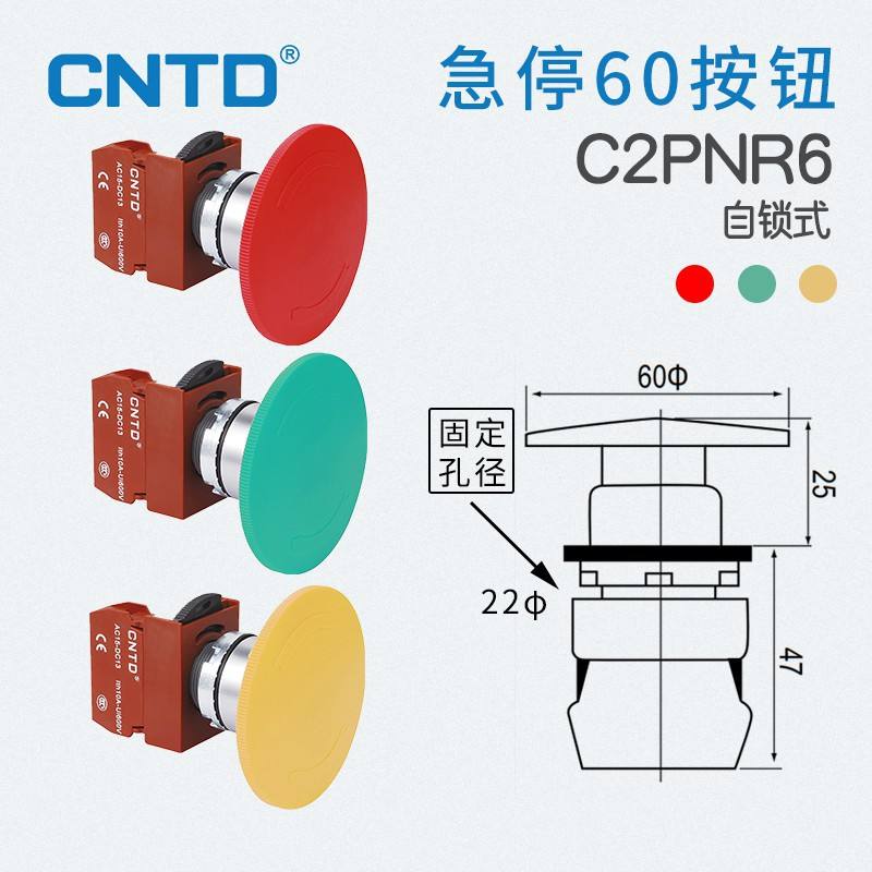 Interruptor de Botón de Parada de Emergencia Autoblocante CNTD Changde C2PNR6, Tamaño del Cabezal de 60 mm, 1A Máx. Corriente Máxima de 12V Material Metálico de Voltaje