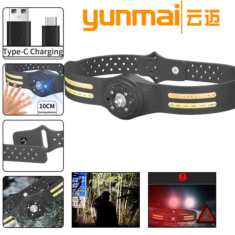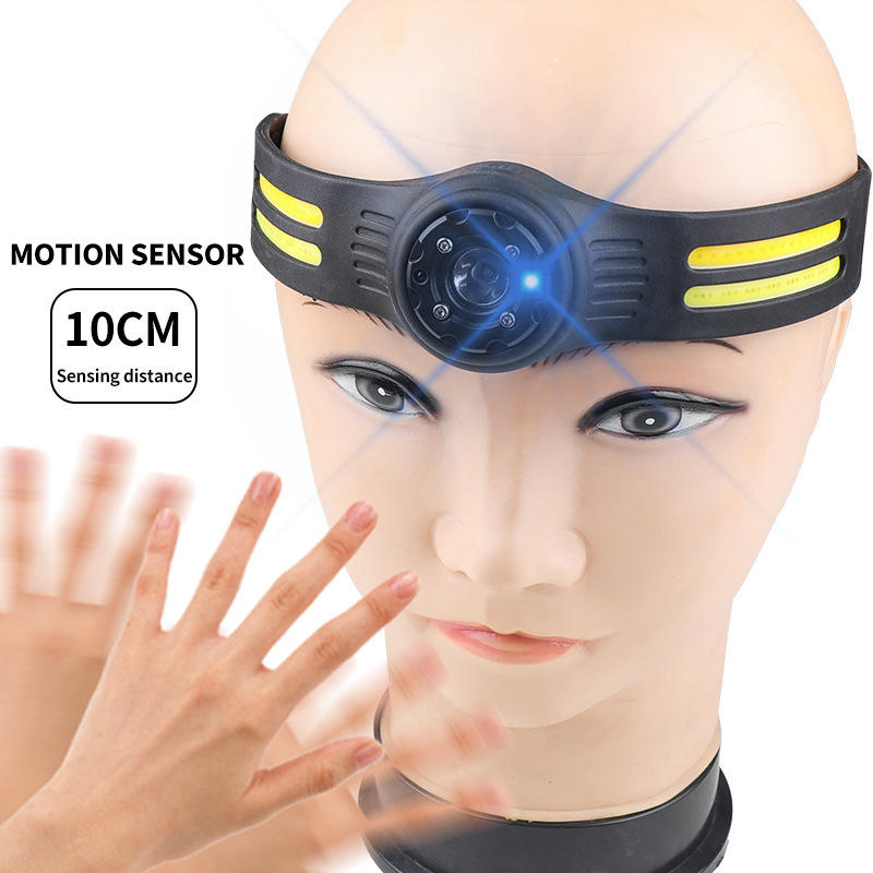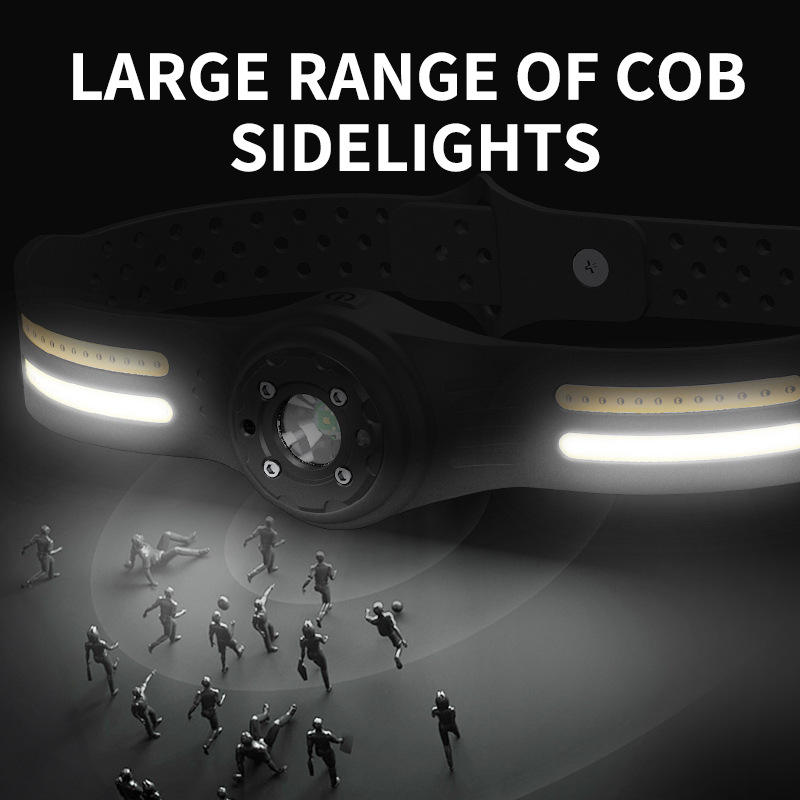Linterna frontal COB con batería incorporada, carga tipo C, ajustable, ligera, con tira LED para uso en exteriores.