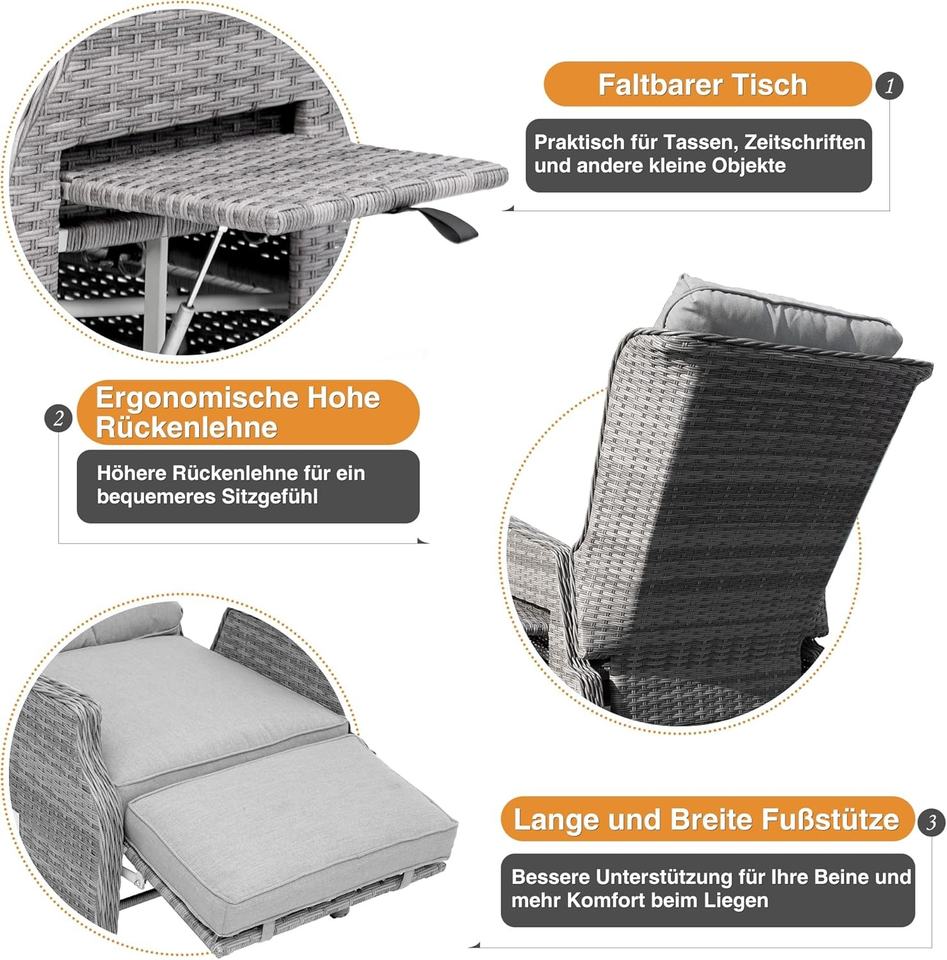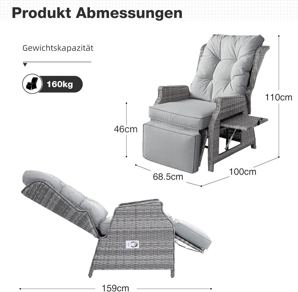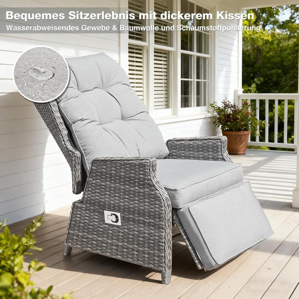 Silla de Jardín Reclinable Acolchada con Respaldo Acolchado COMLAX FIELD, Resistente a la Intemperie, Ajustable, con Marco de Ratán Sintético, Color Gris Claro, Tumbona para