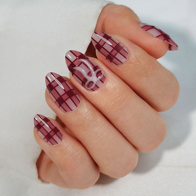 Uñas postizas de lujo CPNP MSDS, estilo almendra corta, con diseño de tablero de ajedrez rojo oscuro, de gel suave, a presión, para venta al por mayor.