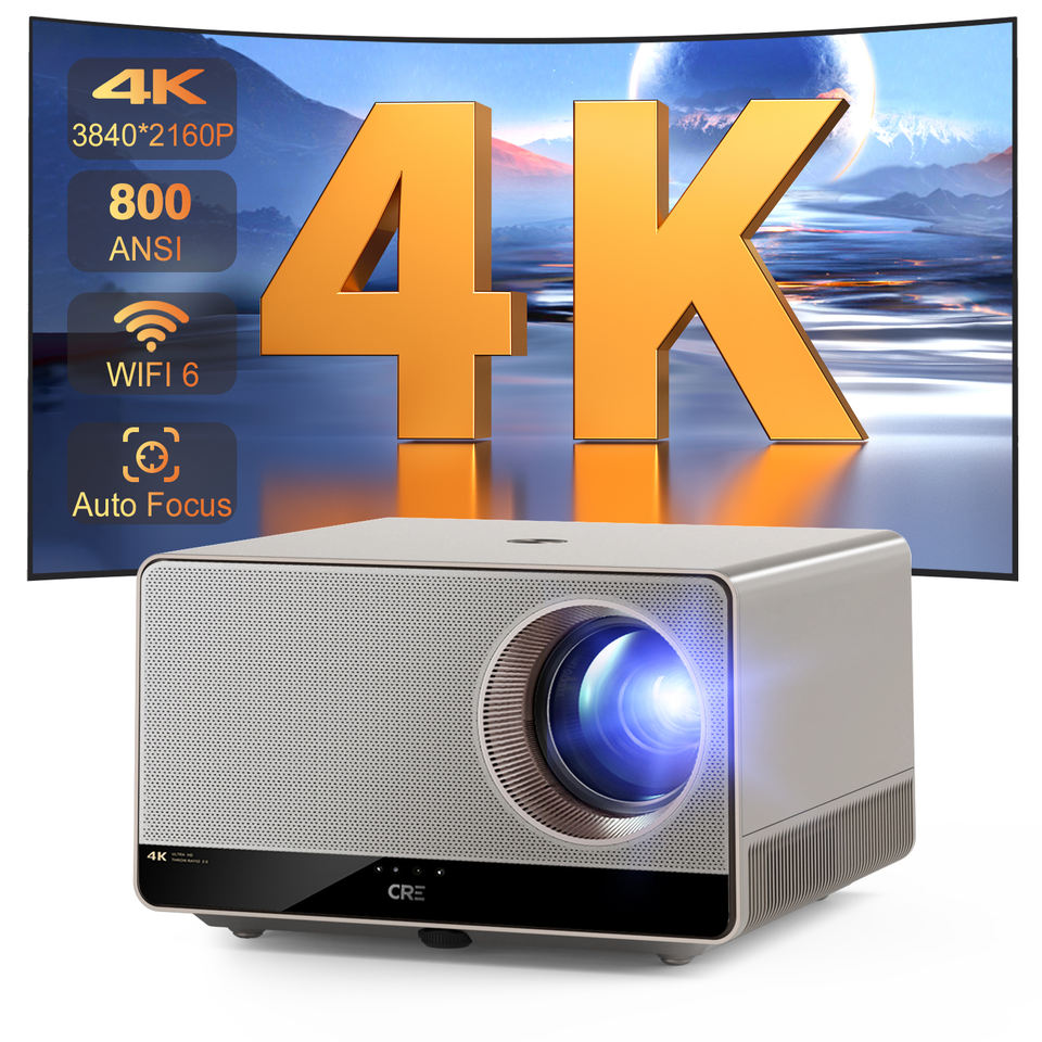 Proyector CRE Nativo 4K, Cine en Casa, Proyector Inteligente de 800 ANSI con Enfoque Automático, Proyector de Video con Altavoces Integrados de 12 W