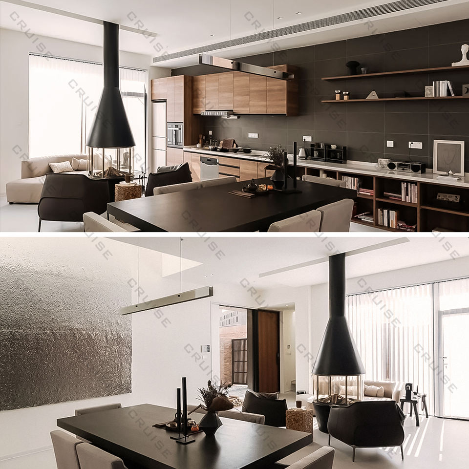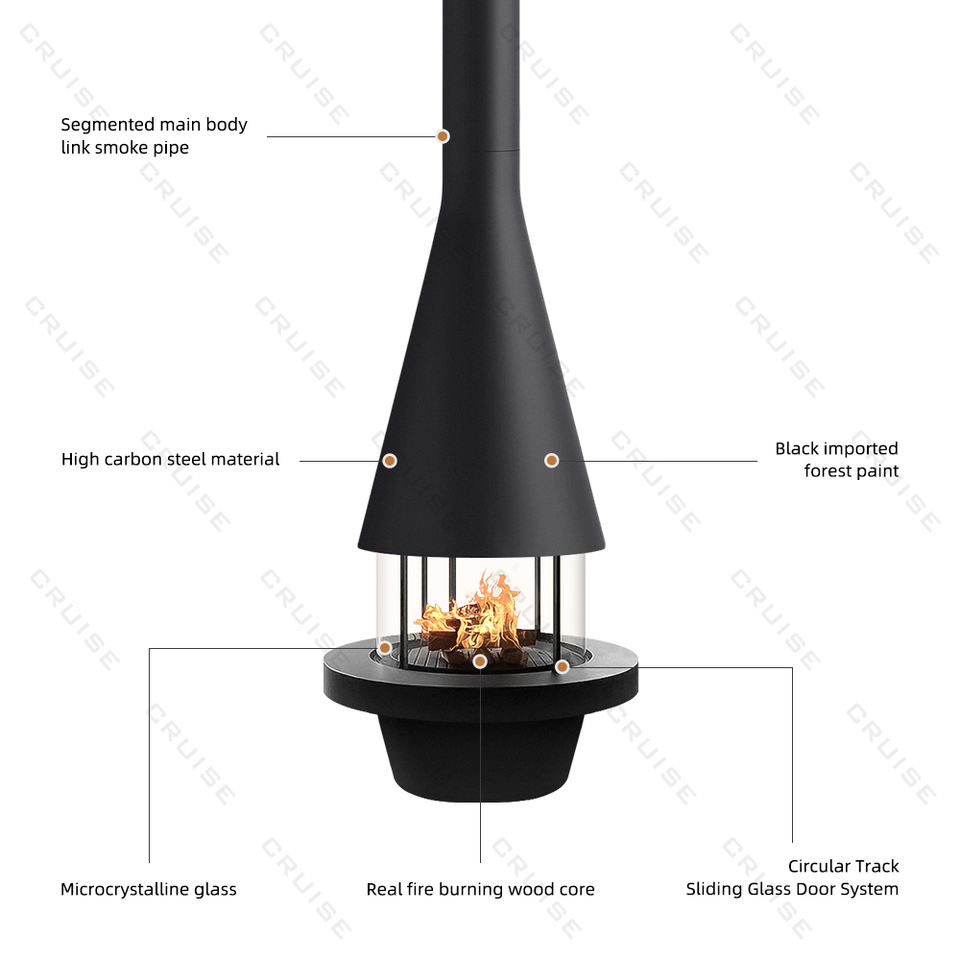 Chimenea colgante laminada en frío de crucero, carbón electrónico/etanol/quema de madera/atomización, chimenea suspendida de 1100mm con vidrio