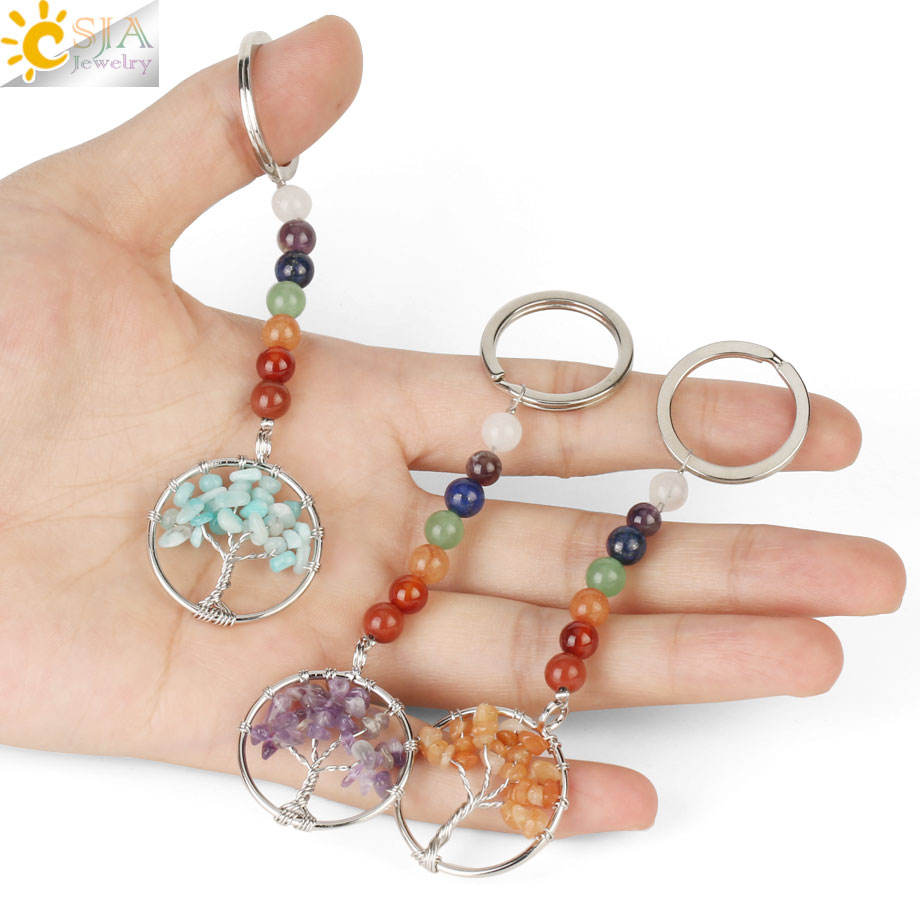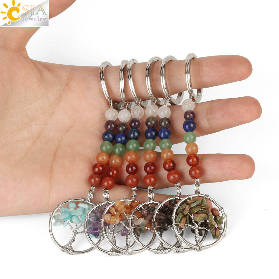 CSJA caliente 7 Chakra Árbol de la vida colgante llavero piedra Natural Reiki llavero G312