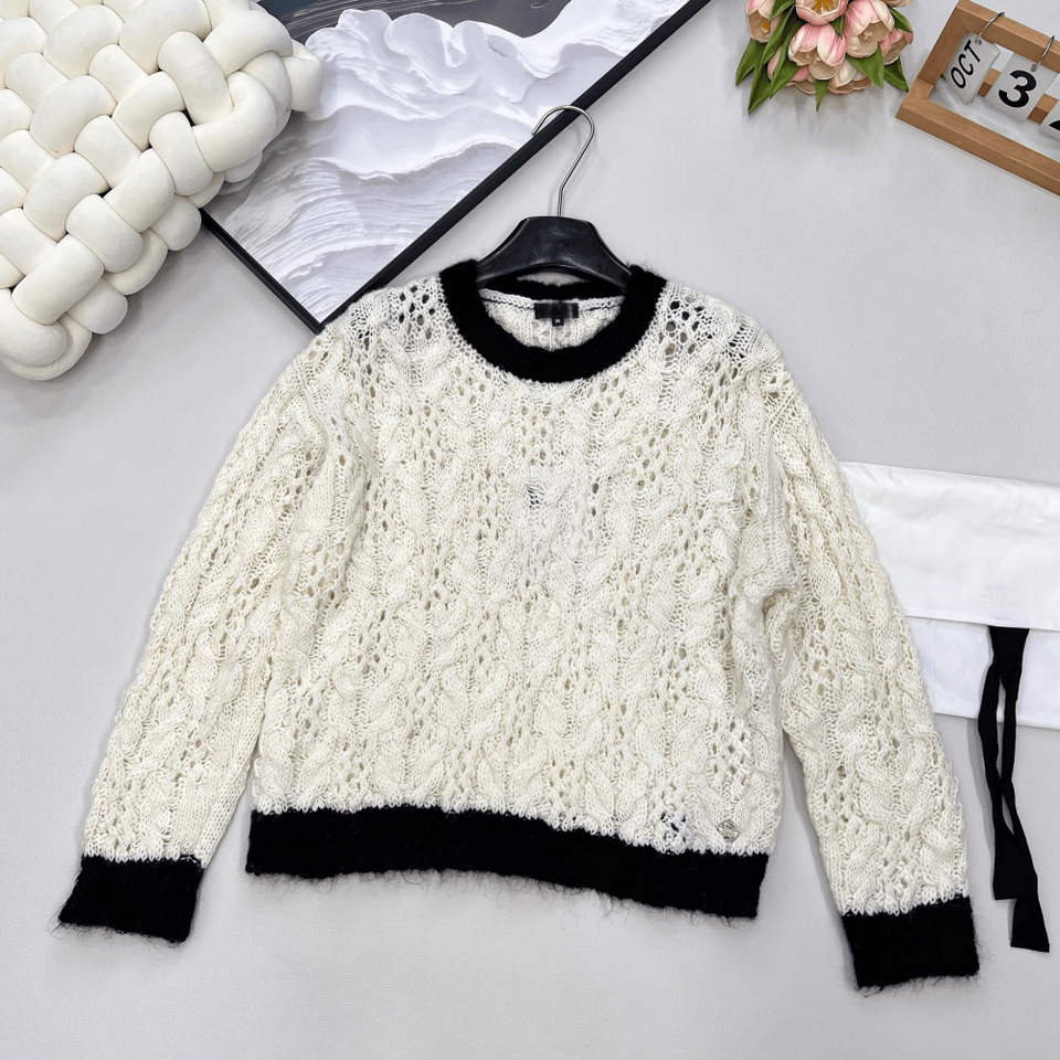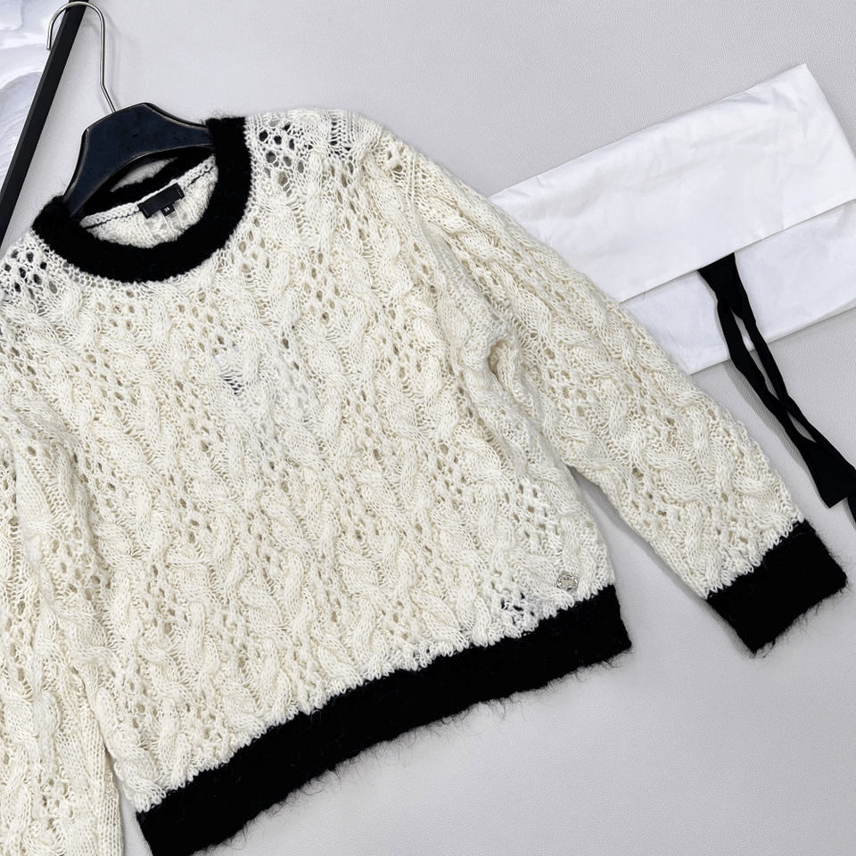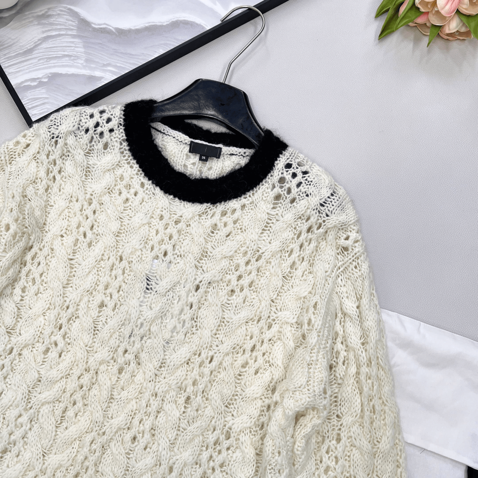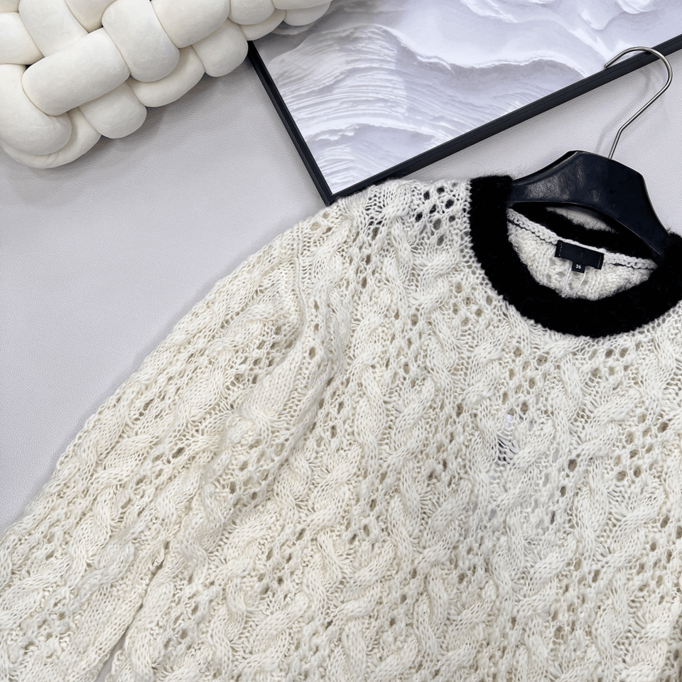 Suéter de punto trenzado calado con cuello redondo, jersey de punto texturizado con ribete en contraste para uso casual y de oficina