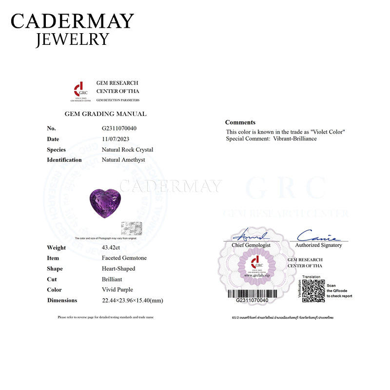 Cadermay Natural Amethyst Heart Cut 43.42ct Vivid Purple Loose Stone For Jewelry Making