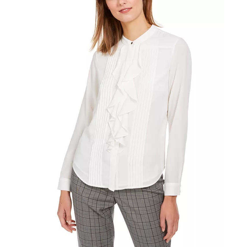 Blusa Calvin Klein para Mujer con Volantes y Botones al Frente, Logotipo Bordado, Color Blanco Sólido, Tallas XS-XL, para Oficina, Otoño, Chifón, Popelina, Tejido de Punto