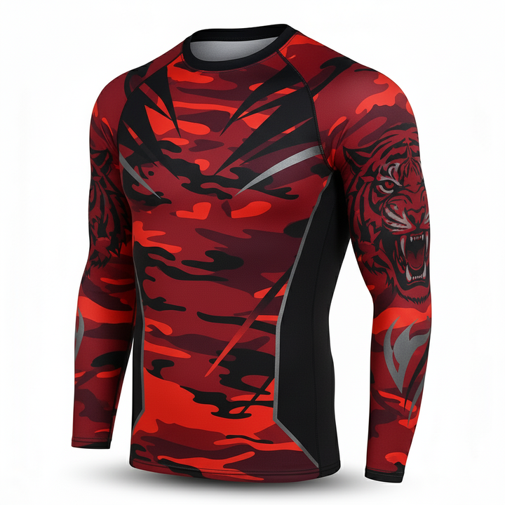 Rashguard de compresión unisex con estampado digital de camuflaje, logotipo personalizado, gráfico a color, para MMA, Jiu Jitsu, poliéster/nailon, de secado rápido.