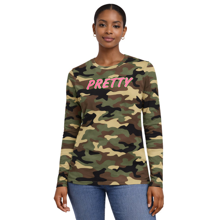 Camiseta de Manga Larga con Estampado de Camuflaje para Mujer, Ropa de Hermandad Griega, Color Rosa y Verde, Estilo Universitario, Ropa Griega Elegante