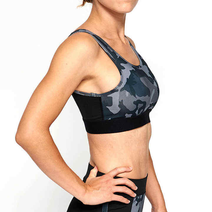 Camuflaje impreso personalizado de talla grande ligero sin costuras lavado frontal alto soporte correa ajustable Sujetador deportivo de mujer para Yoga