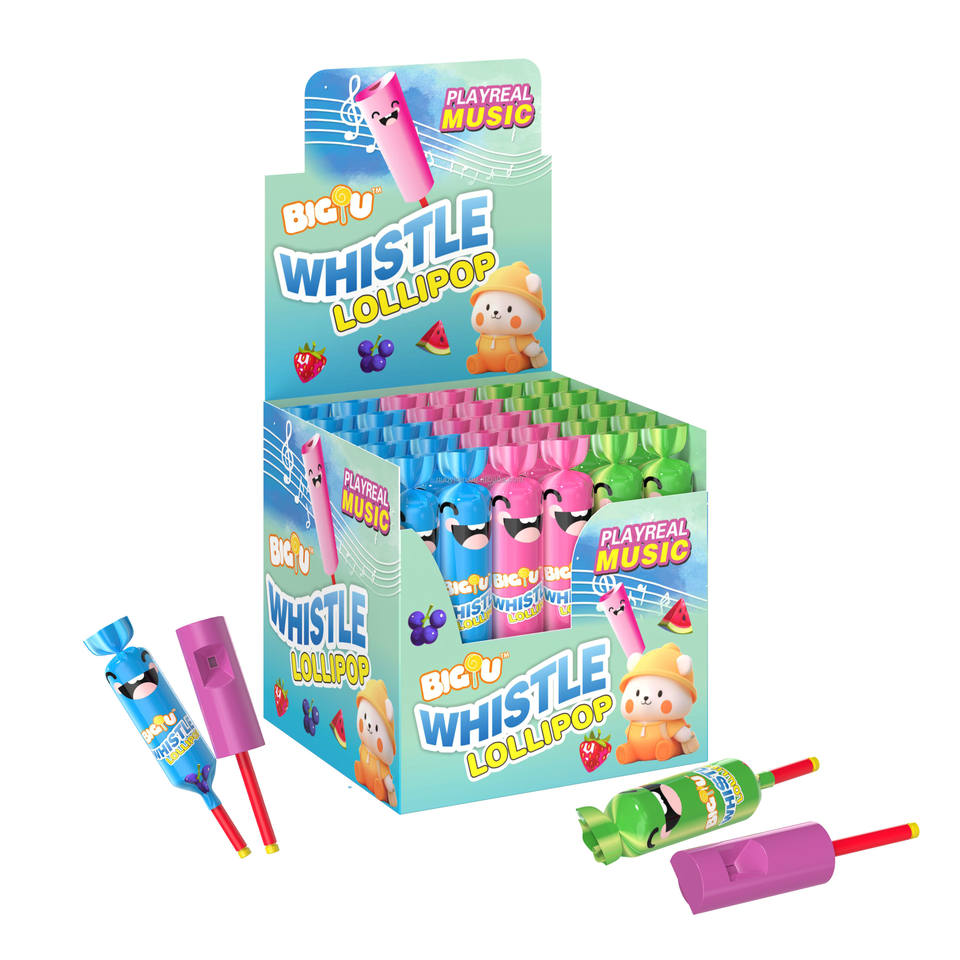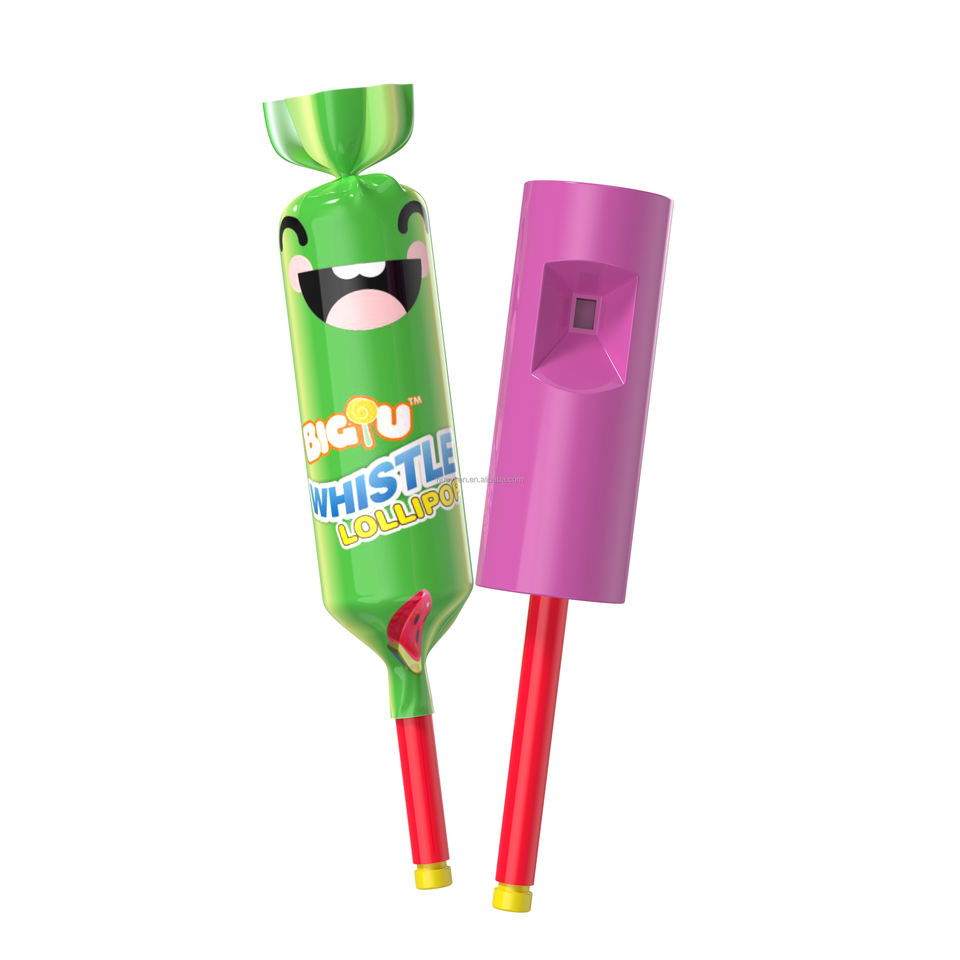 Fabricante de caramelos personalizado etiqueta privada fruta piruleta con silbato piruleta juguete caramelo