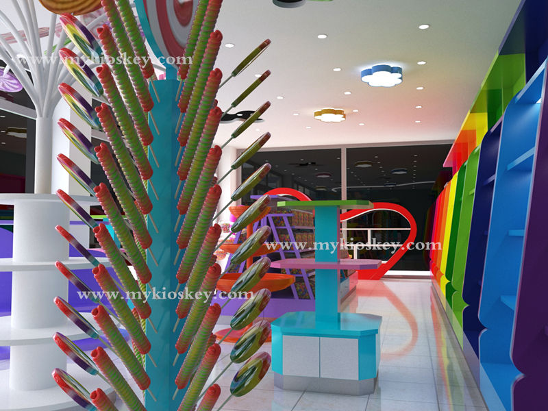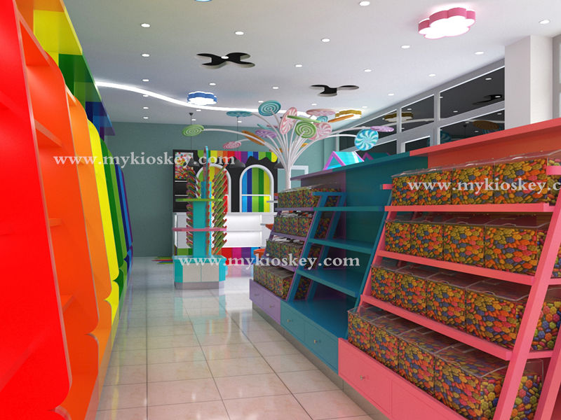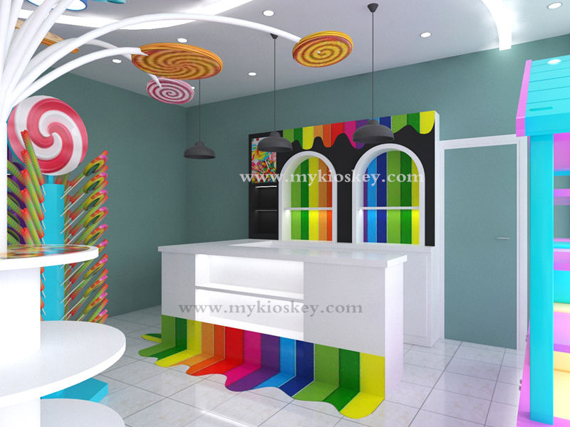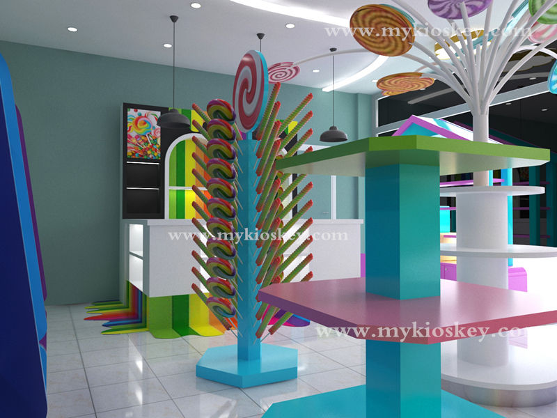 Tienda de dulces, muebles de diseño interior, estantes de dulces