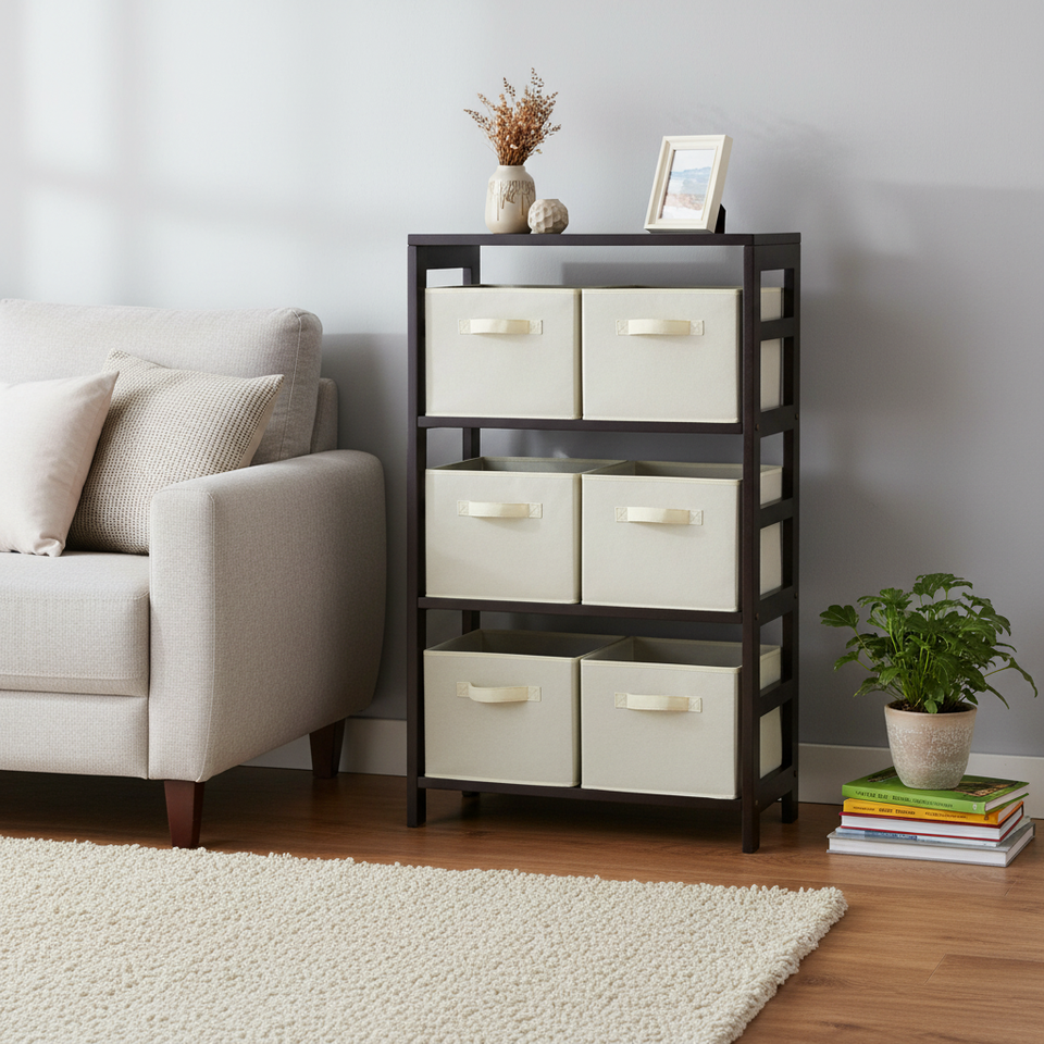 Estante de Almacenamiento Capri de 3 Secciones con 6 Cestas de Tela Beige, Modelo Plegable D0100HHCUBA