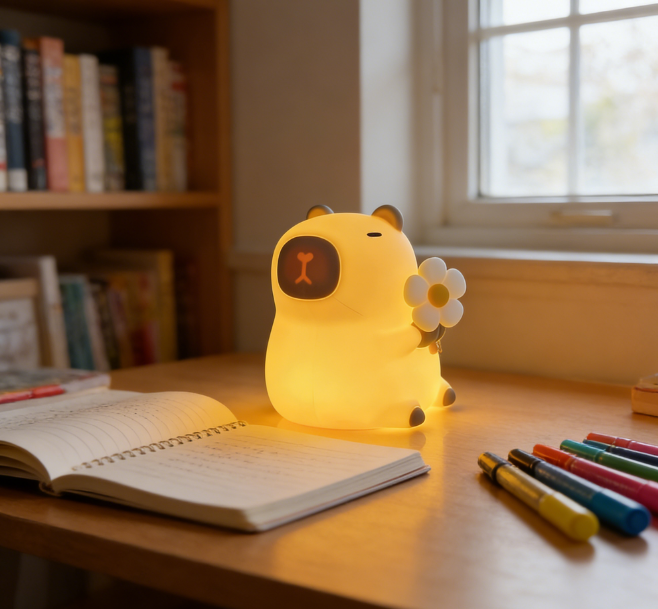 palabras clave:Luz nocturna LED de silicona con forma de carpincho.