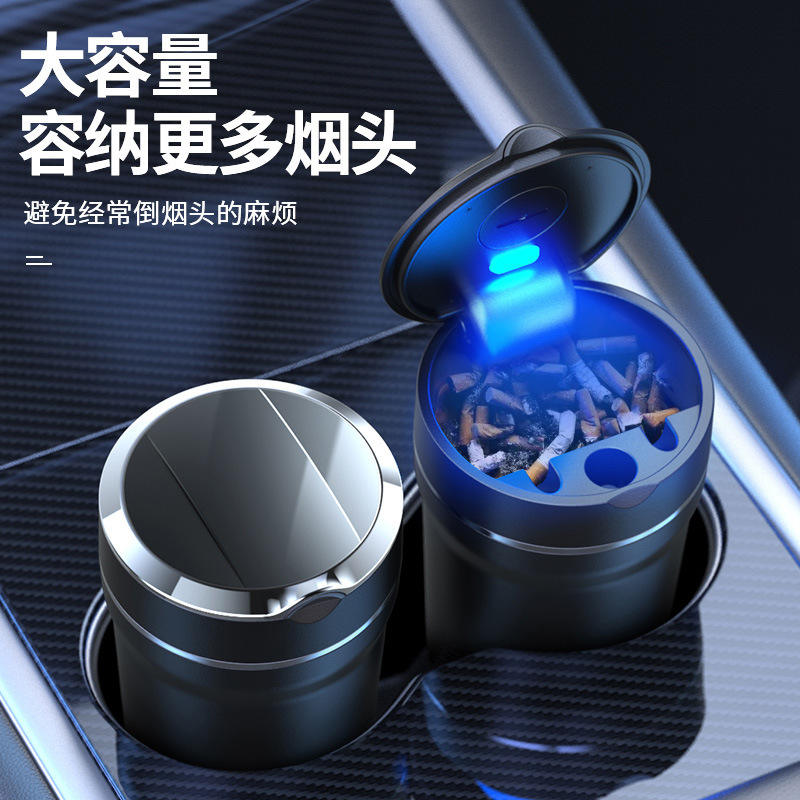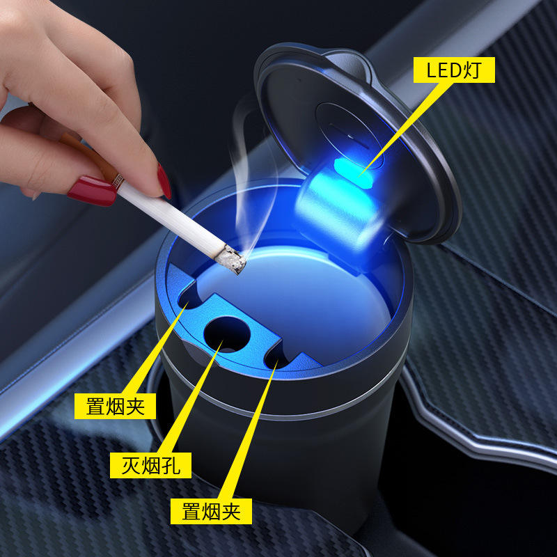 Cenicero para coche con luz LED, tapa abatible para portavasos, material plástico, diseño a prueba de polvo