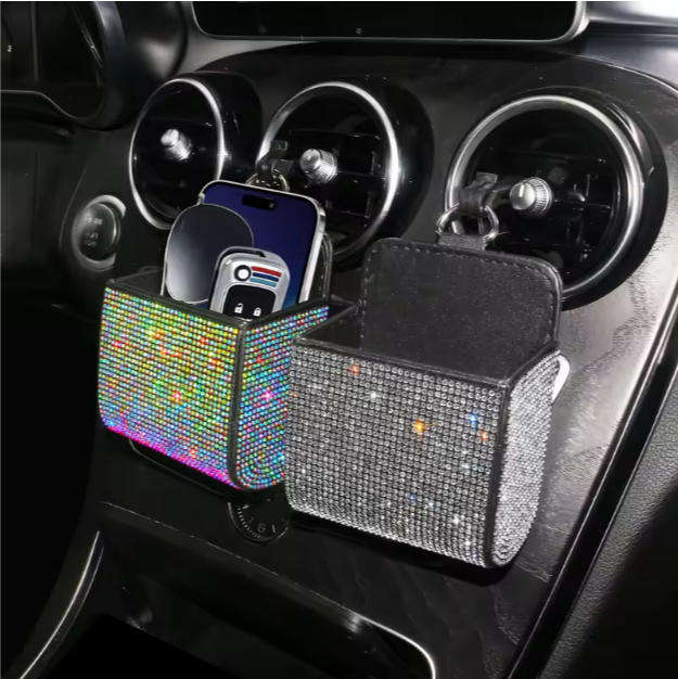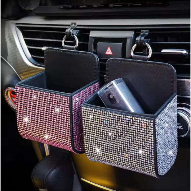 Caja de Almacenamiento para Auto, Porta Teléfono con Incrustaciones de Diamantes, Organizador Multifuncional para Rejilla de Ventilación, Bolsa de Cuero Genuino con Diamantes, Contenedor de Basura