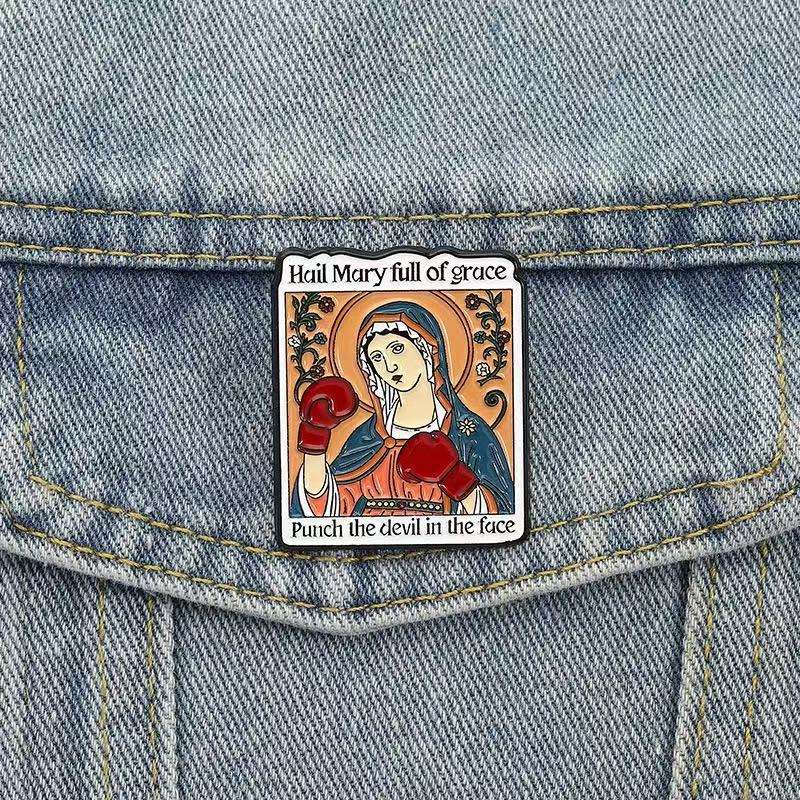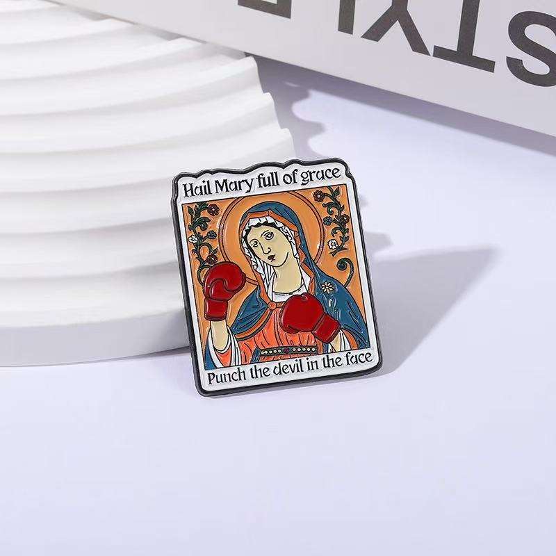 Pins esmaltados de boxeo de dibujos animados Casting Hail Mary Full Grace Punch Devil Face Broches Insignia de solapa Joyería de moda
