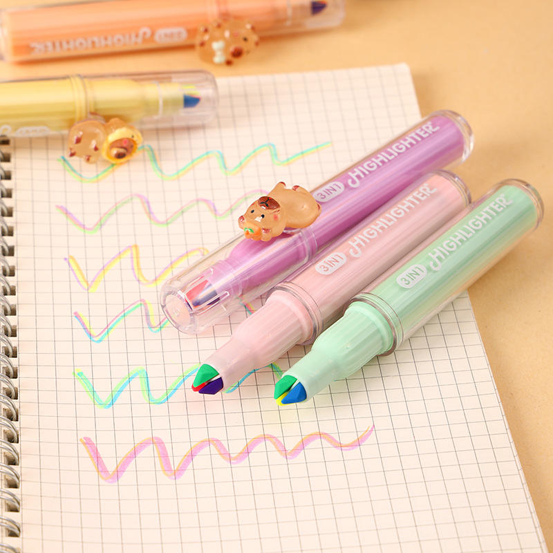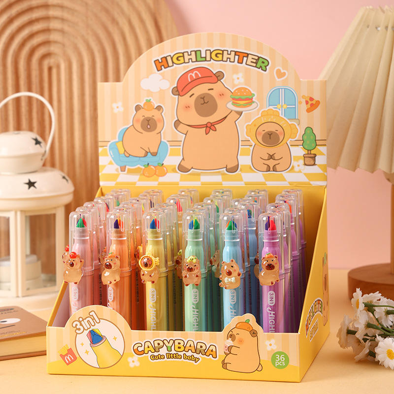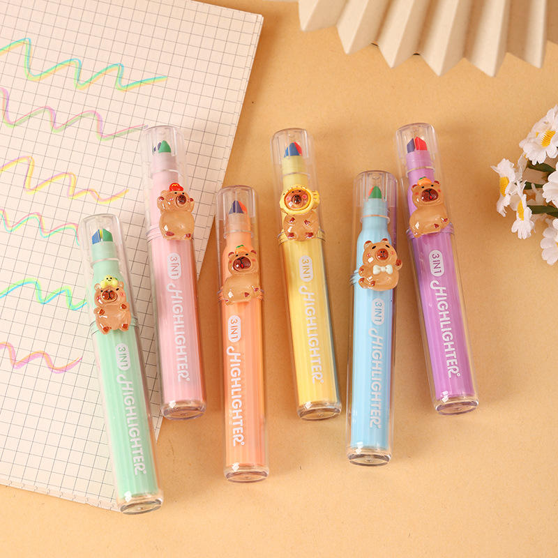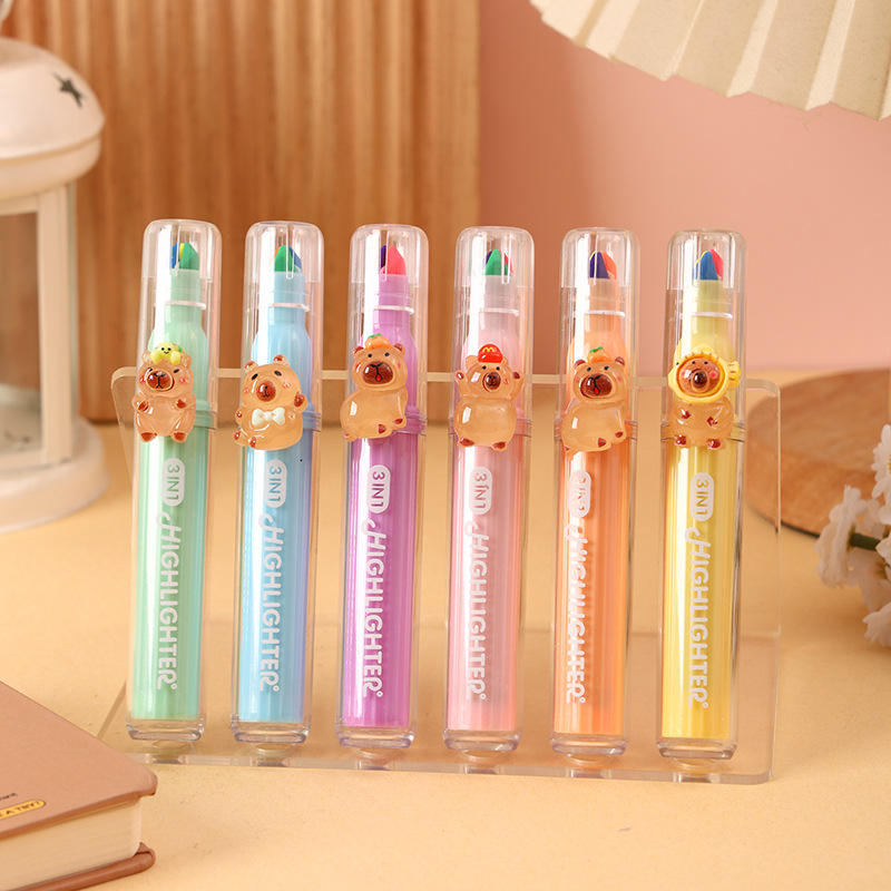 Paquete de 3 Marcadores Fluorescentes con Diseño de Capibara de Dibujos Animados, Bolígrafos de Resina con Diseño Lindo, Bolígrafos para Diario, Premios para Niños