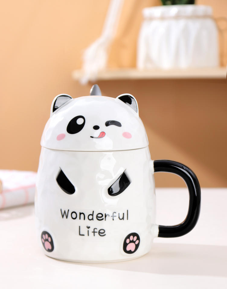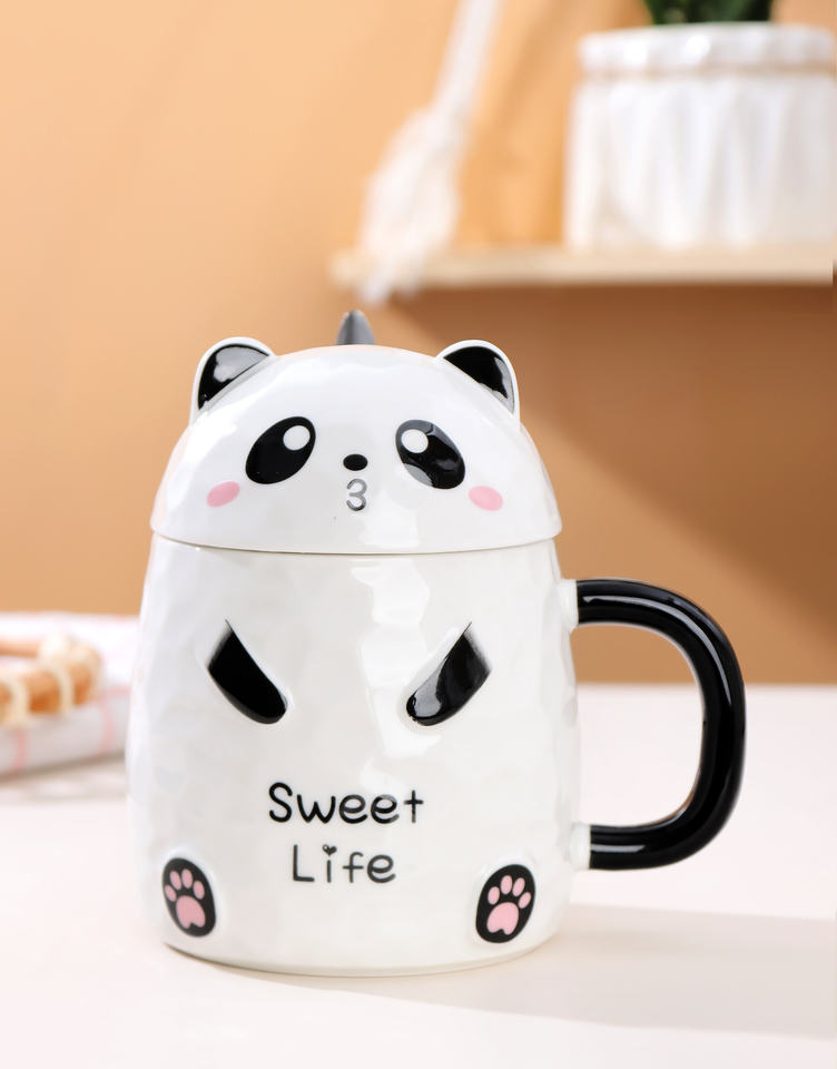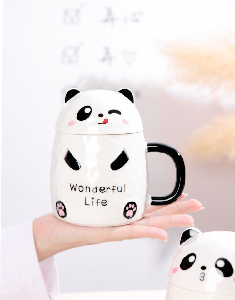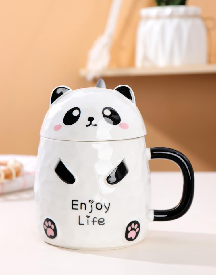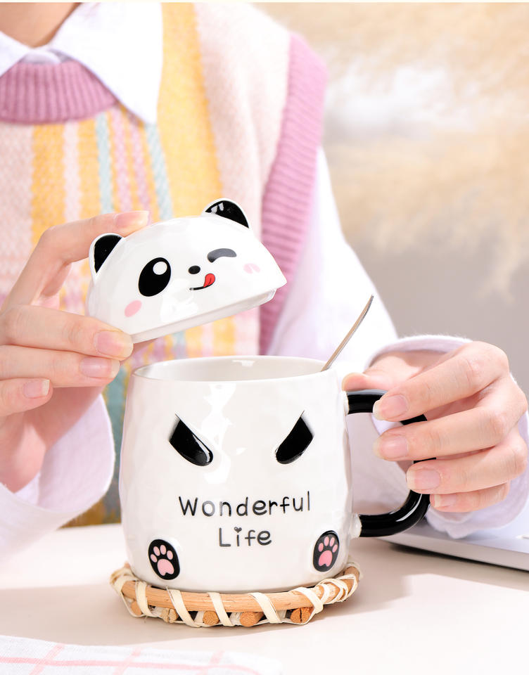 Juego de Tazas de Cerámica para Niños con Forma de Panda, Creativas y Lindas, de 13 oz, Taza de Café de Cerámica con Tapa y Cuchara