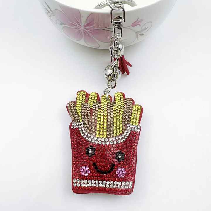 Llavero de Cuero con Diseño de Papas Fritas, Hamburguesa y Perrito Caliente con Diamantes y Borla, Colgante para Bolso