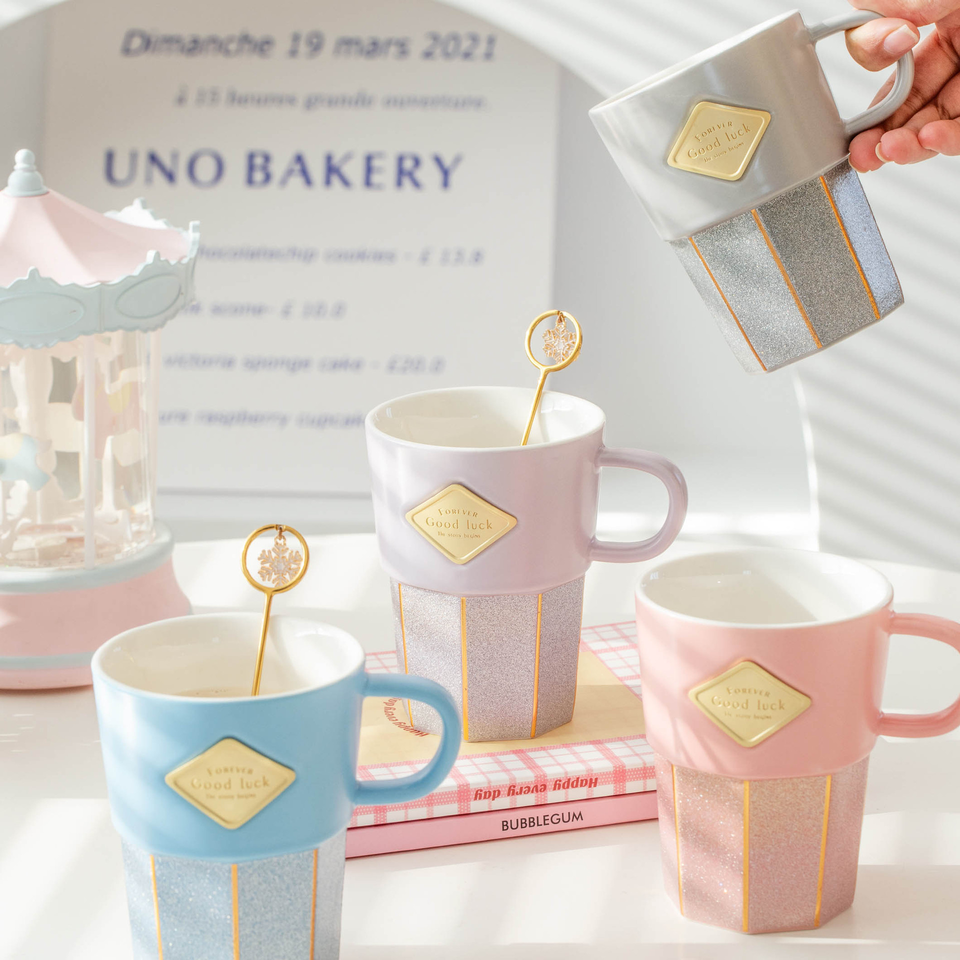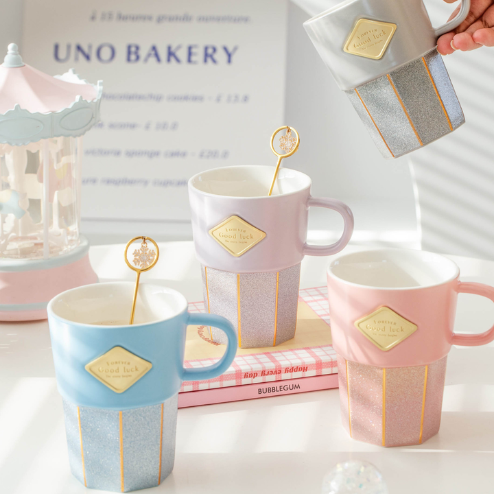 Taza de Café de Cerámica con Purpurina de Dibujos Animados con Borde Dorado, Asa con Placa de Nombre, Capacidad de 320 ml, para Fiestas