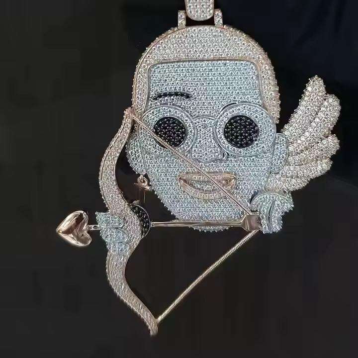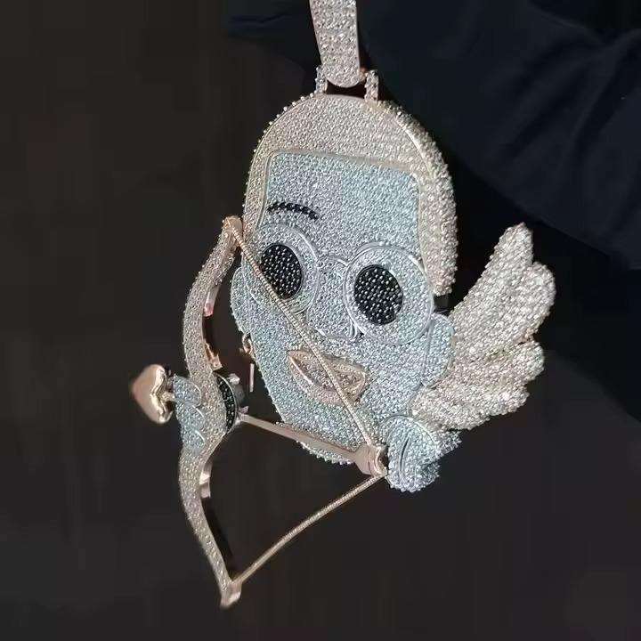 Colgante Unisex de Plata de Ley 925 Sólida con Forma de Dibujo Animado, Estilo Hip Hop, Moissanita Blanca de Corte Brillante, Engastado en Bisel, con Flecha de la Suerte