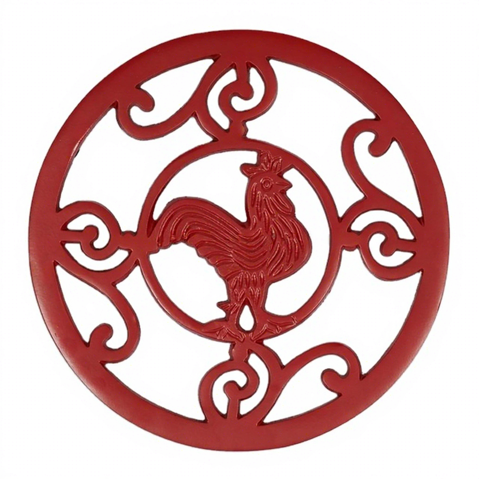 Salvamanteles de cocina de gallo rojo de aluminio fundido con pies de goma para platos calientes