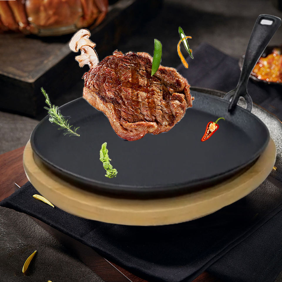 Nombre:Placa De Filete de hierro fundido con base de madera para uso en el hogar o restaurante
