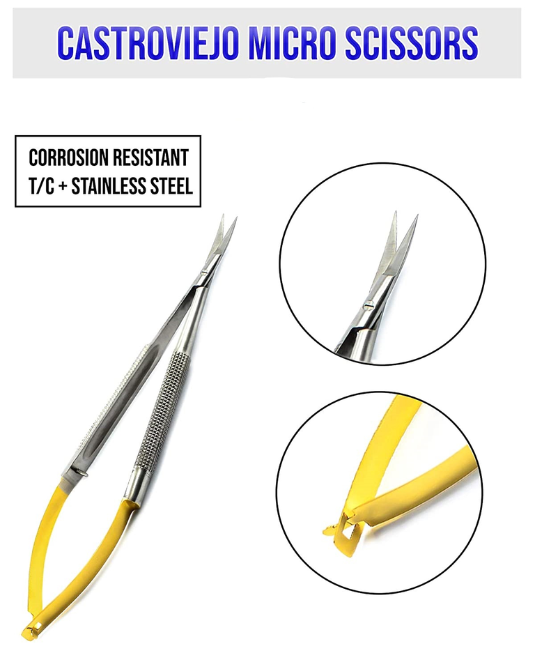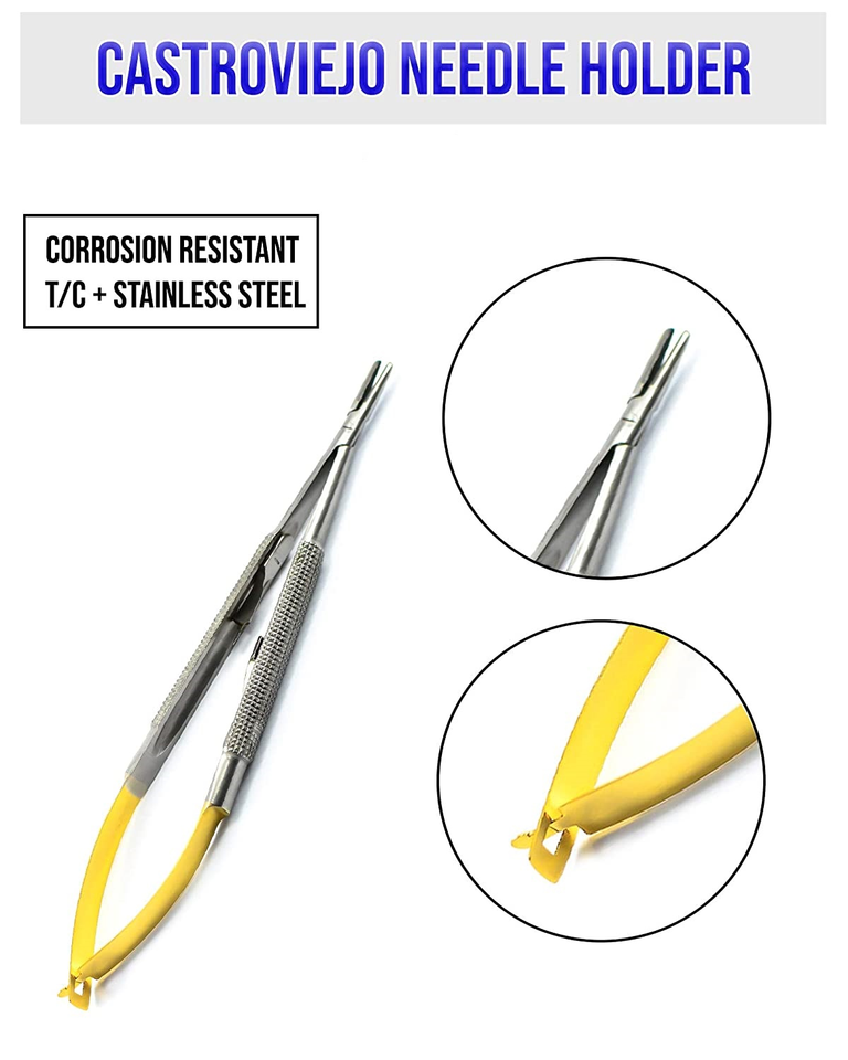 Especificación:3 Castroviejo Micro Cirugía Pinza de Satura Tijeras Aguja Curva TC Pinzas Kit de Cirugía tijera quirúrgica