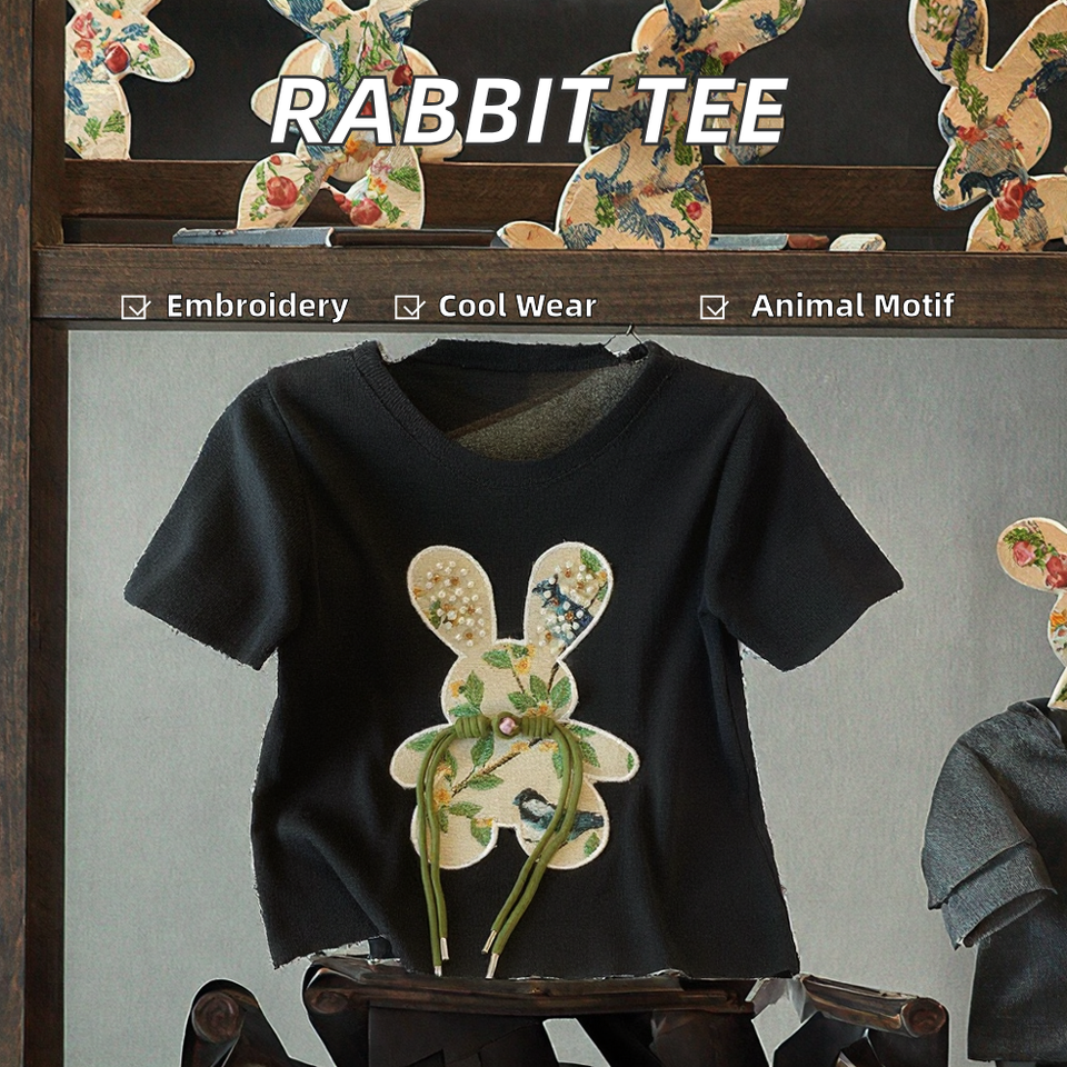 Camiseta informal de moda de verano para mujer con bordado de conejo, Jersey de punto ajustado de manga corta con cuello redondo, Tops hechos de poliéster