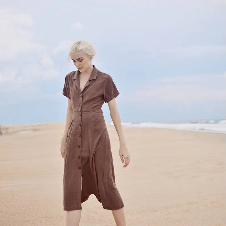 Vestido casual de algodón atemporal, patrón floral, mezcla ligera de lino, manga corta, botones, cintura natural, una grapa para armario