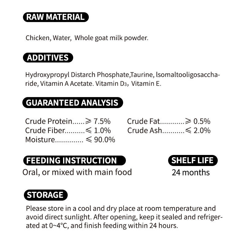 Material principal:Pollo, Agua, Leche entera de cabra en polvo