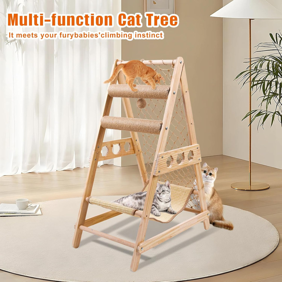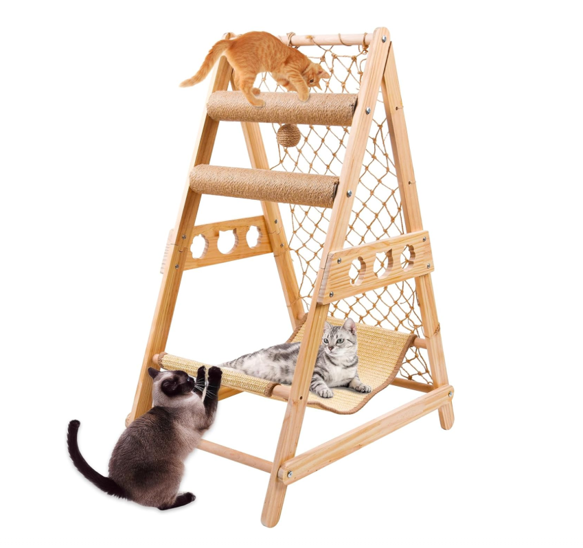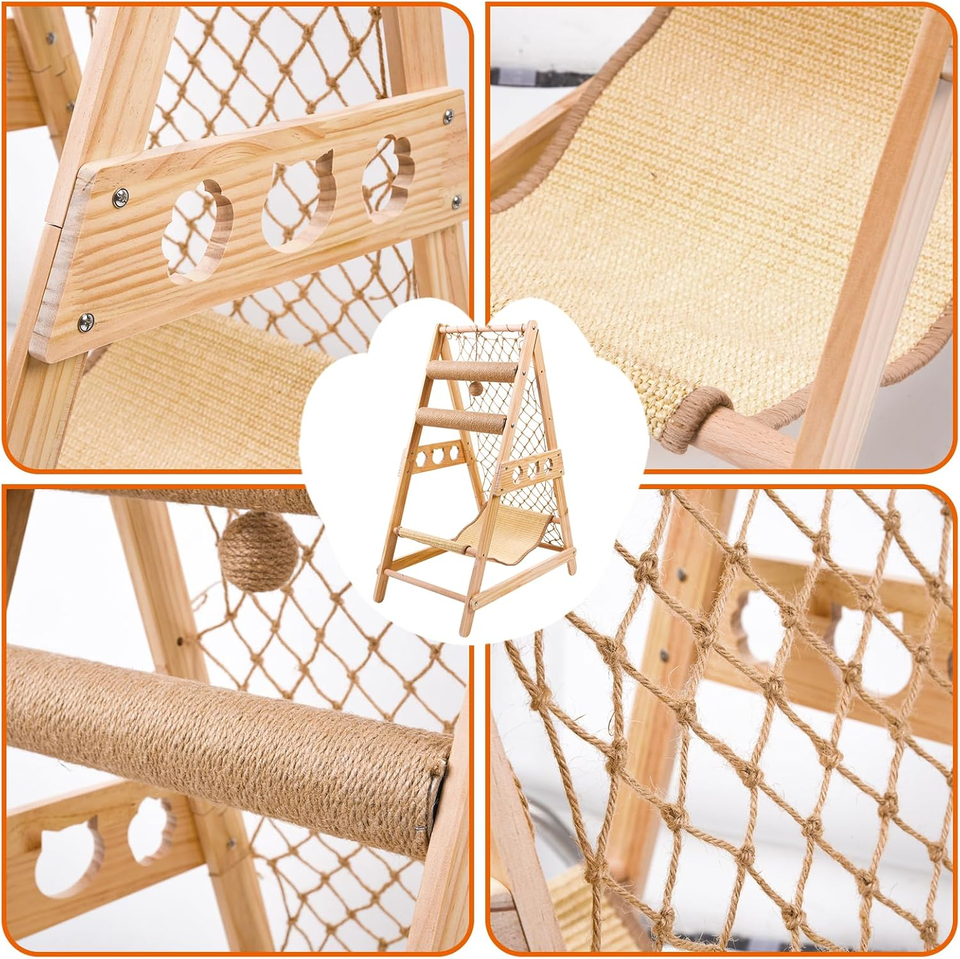 Árbol rascador para gatos con escalera, hamaca, poste rascador, red de escalada y bola de sisal colgante