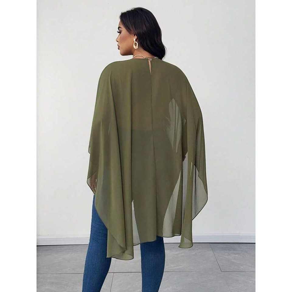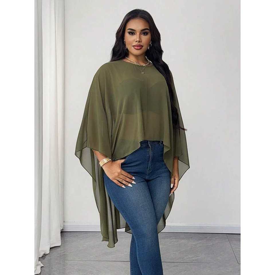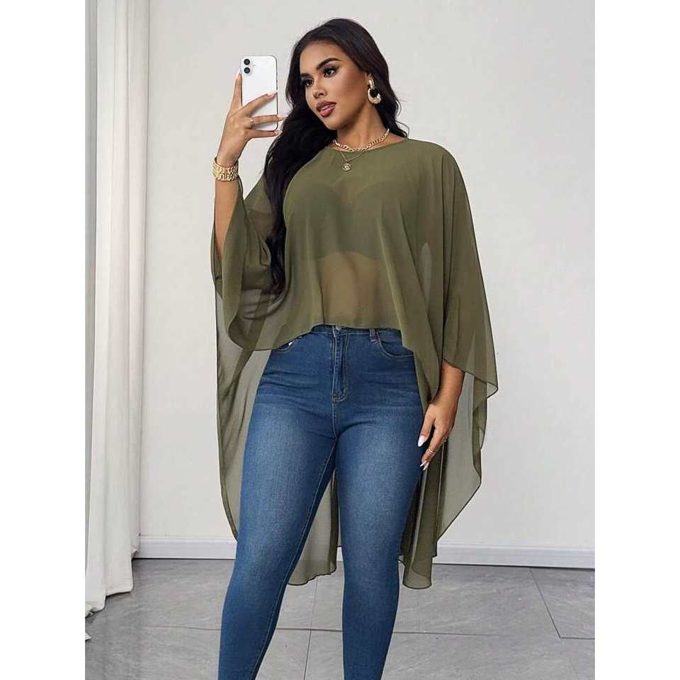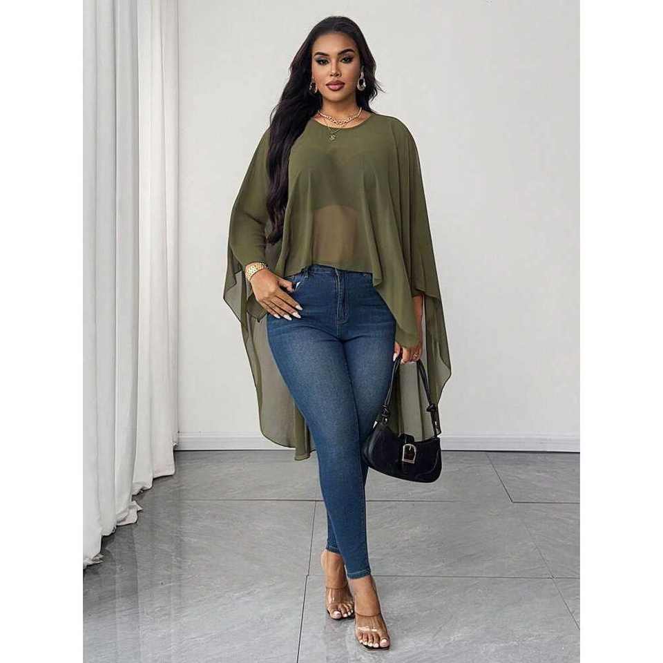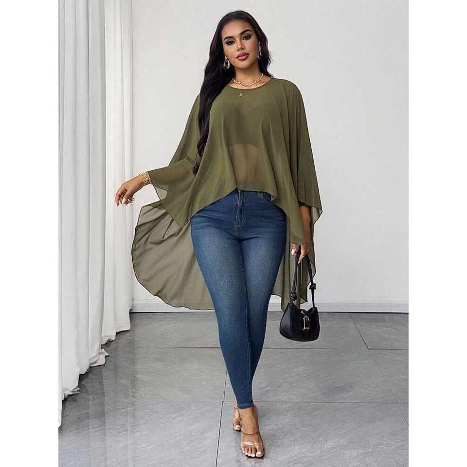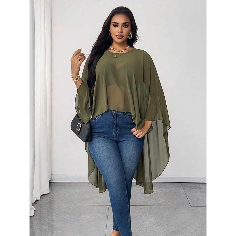 Celure Blusa larga informal de verano para mujer de talla grande de color sólido con cuello redondo de malla frente corto trasero