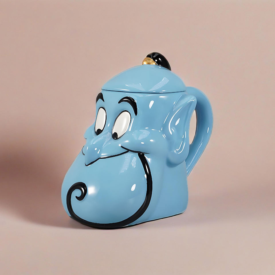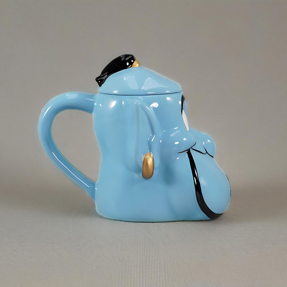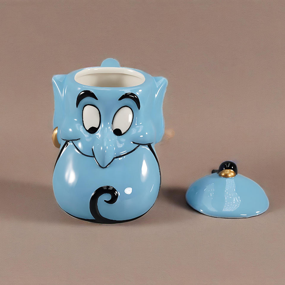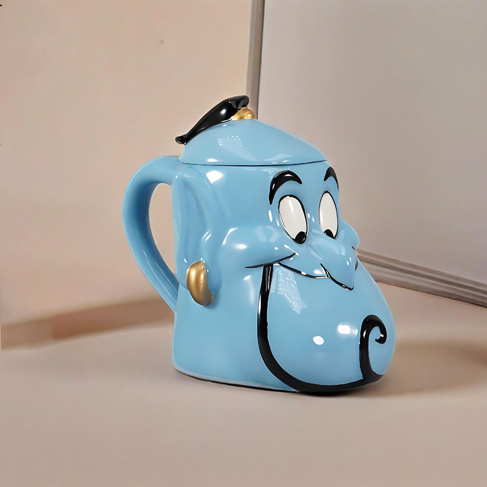 Taza de café de cerámica 3D con personaje de dibujos animados, taza azul con forma de genio y tapa, para hogar u oficina