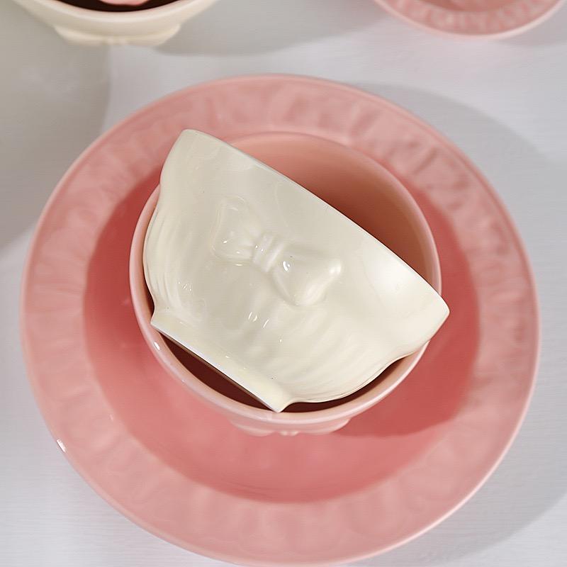 Juego de vajilla de cerámica con patrón en relieve tridimensional tipo cinta, textura lisa y esmaltada, duradero, libre de BPA, color rosa cremoso.