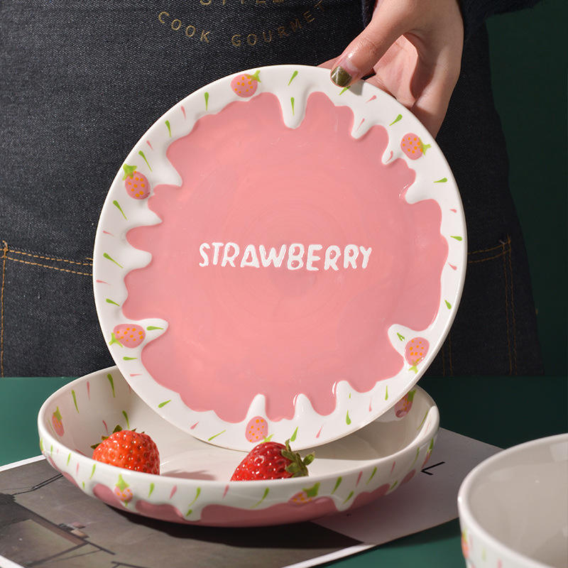 Juego de Cuatro Tazones de Cerámica con Diseño en Relieve, Color Rosa Fresa, para Helado, Desayuno, Venta al por Mayor
