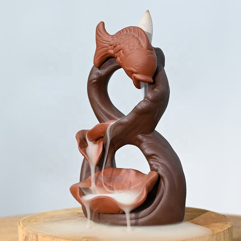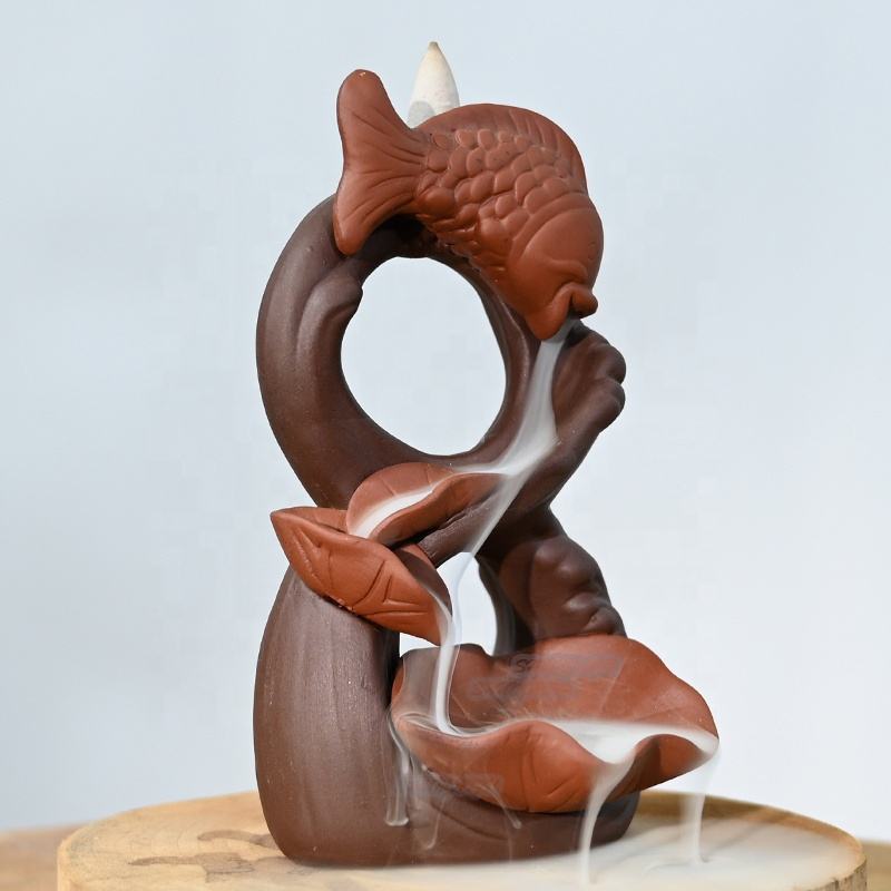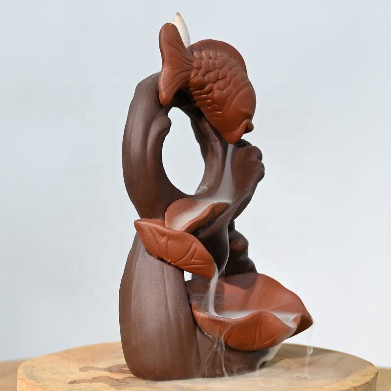 Peces de cerámica jugando hoja de loto de reflujo incienso quemador cascada