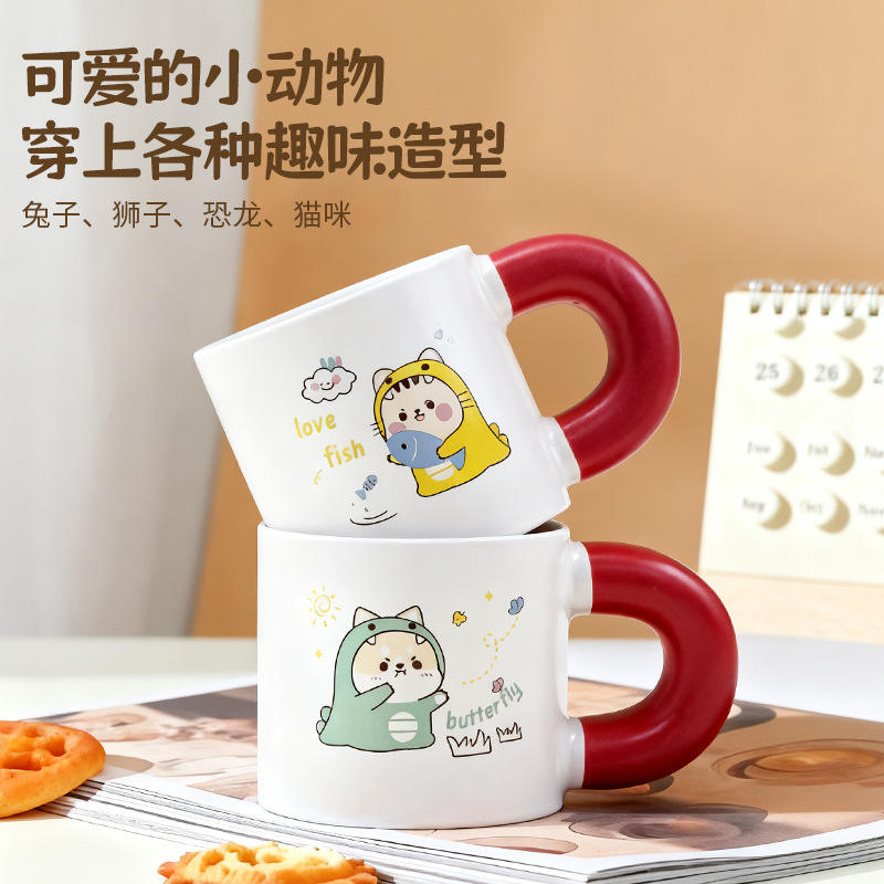 Taza de cerámica con diseño de gato de dibujos animados, asa roja, regalo lindo para niñas