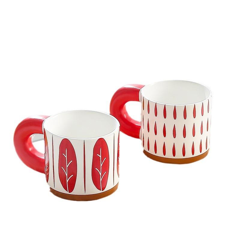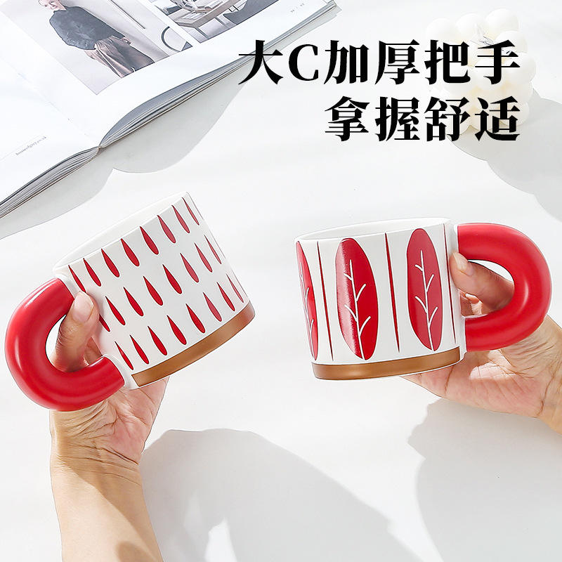 Taza de Cerámica con Asa Roja, Diseño Moderno con Patrón de Hojas, Apta para Lavavajillas y Microondas, para Café, Agua, Regalo para Parejas