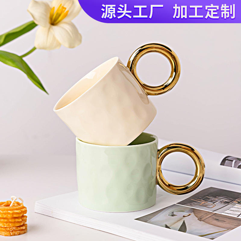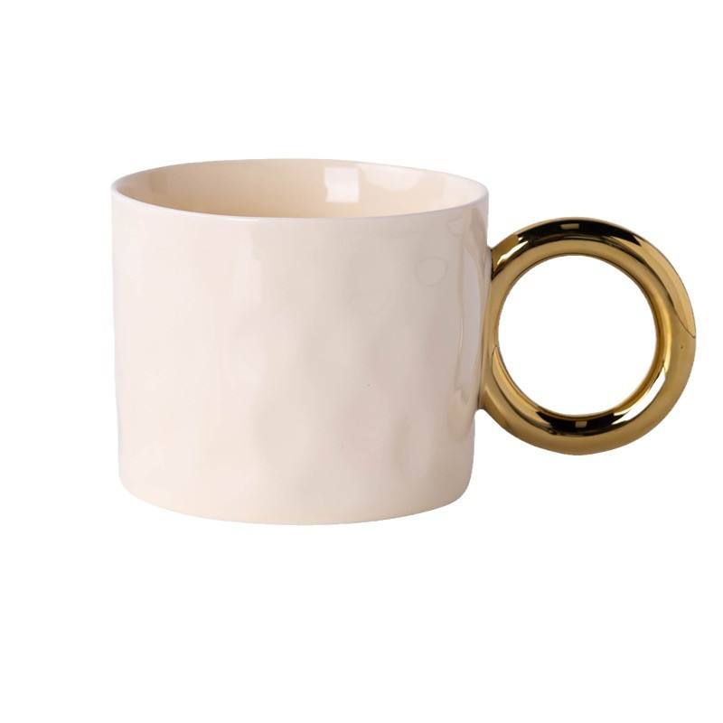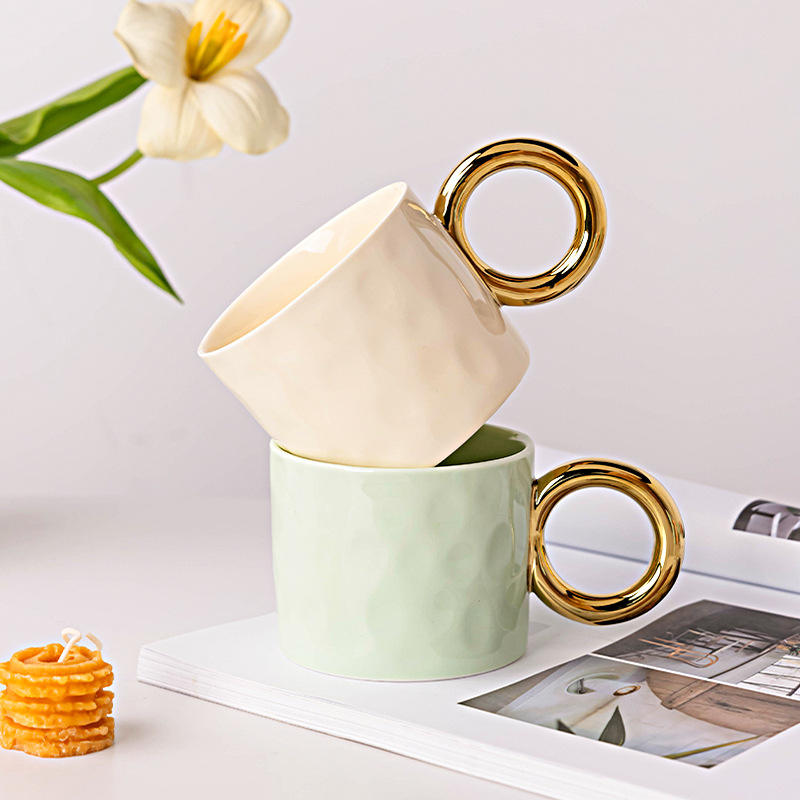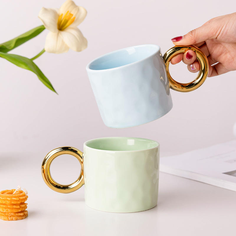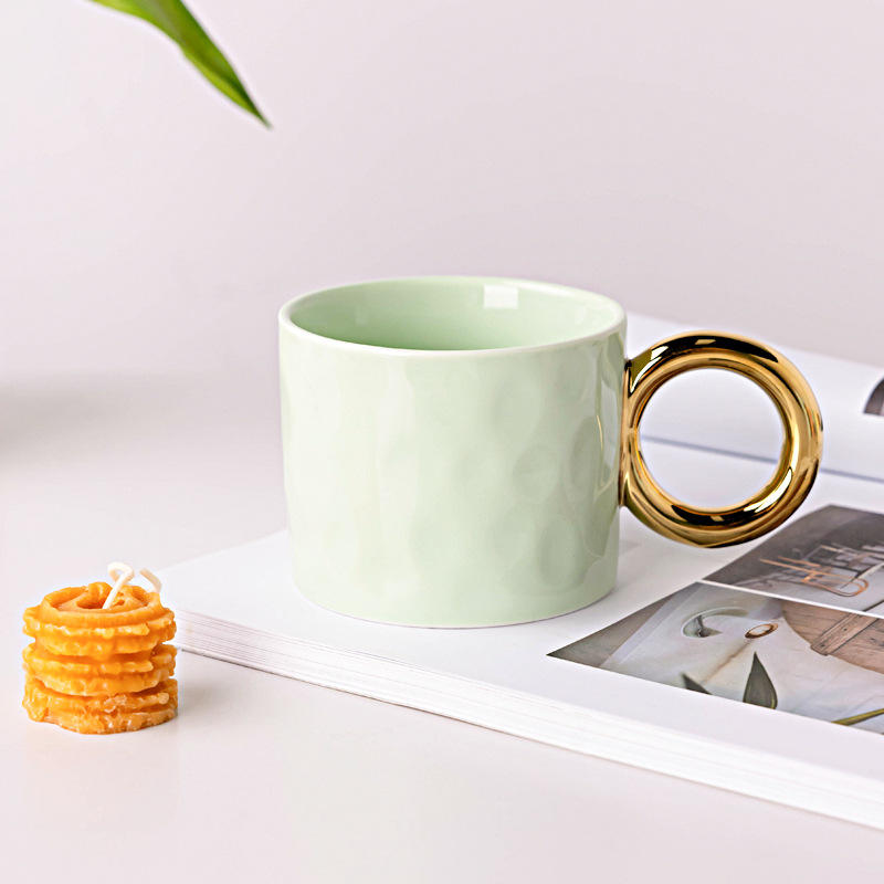 Taza de cerámica con asa de anillo dorado, taza de café de color sólido para uso diario