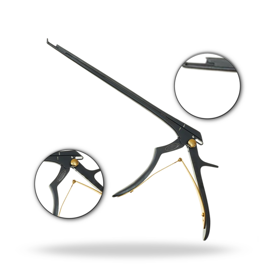 Especificación:Instrumento quirúrgico de precisión con recubrimiento cerámico, disponible en tamaños de mordida de 1 mm a 5 mm, diseñado para procedimientos profesionales de neurocirugía de columna.