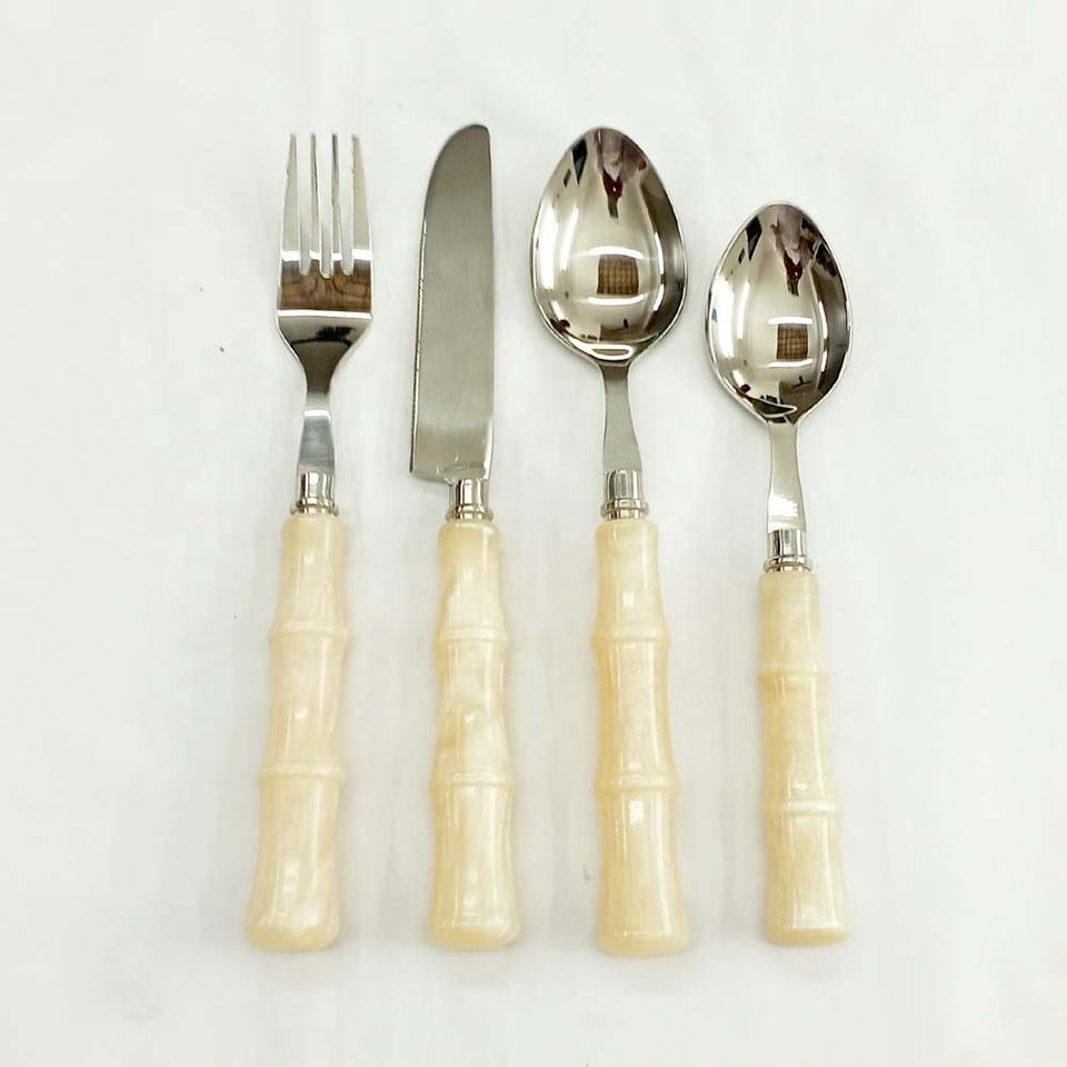 Juego de cubiertos de mango largo redondo de cerámica Estilo portugués Acero inoxidable Espejo plateado Pulido Logotipo de color personalizado Cubiertos de lujo