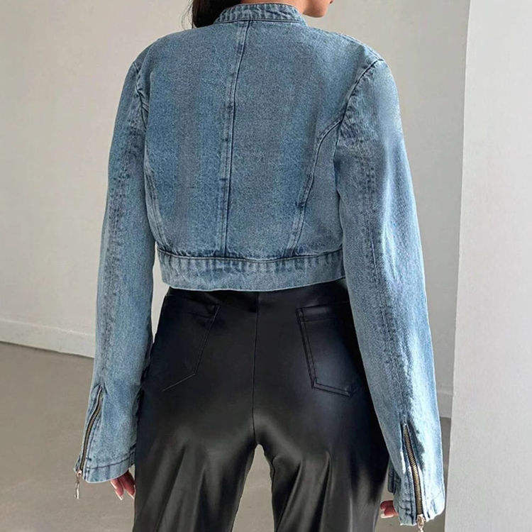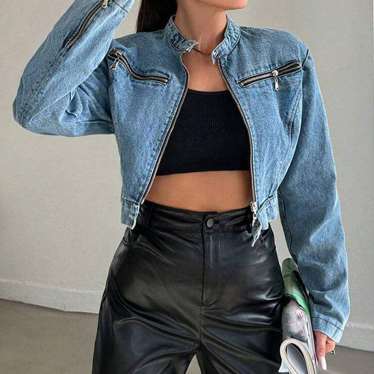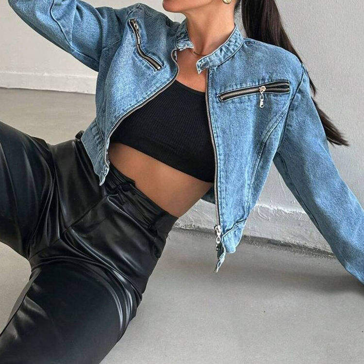 Channel New Arrivals 2025 Chaqueta de abrigo corto de motocicleta lavada Chaquetas de mezclilla recortadas con cremallera y cuello levantado para mujer